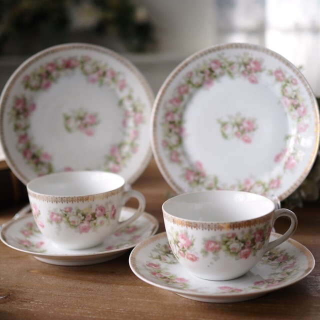 【美品】英国アンティーク プレシェリー Foley 薔薇リースの可憐なトリオ