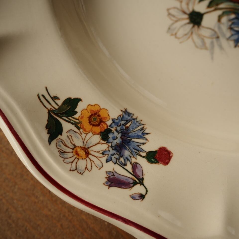 まるでフランスの田園を切り取ったような、柔らかくも生命力あふれるブーケが、器の中央とリムに色とりどりに描かれています。