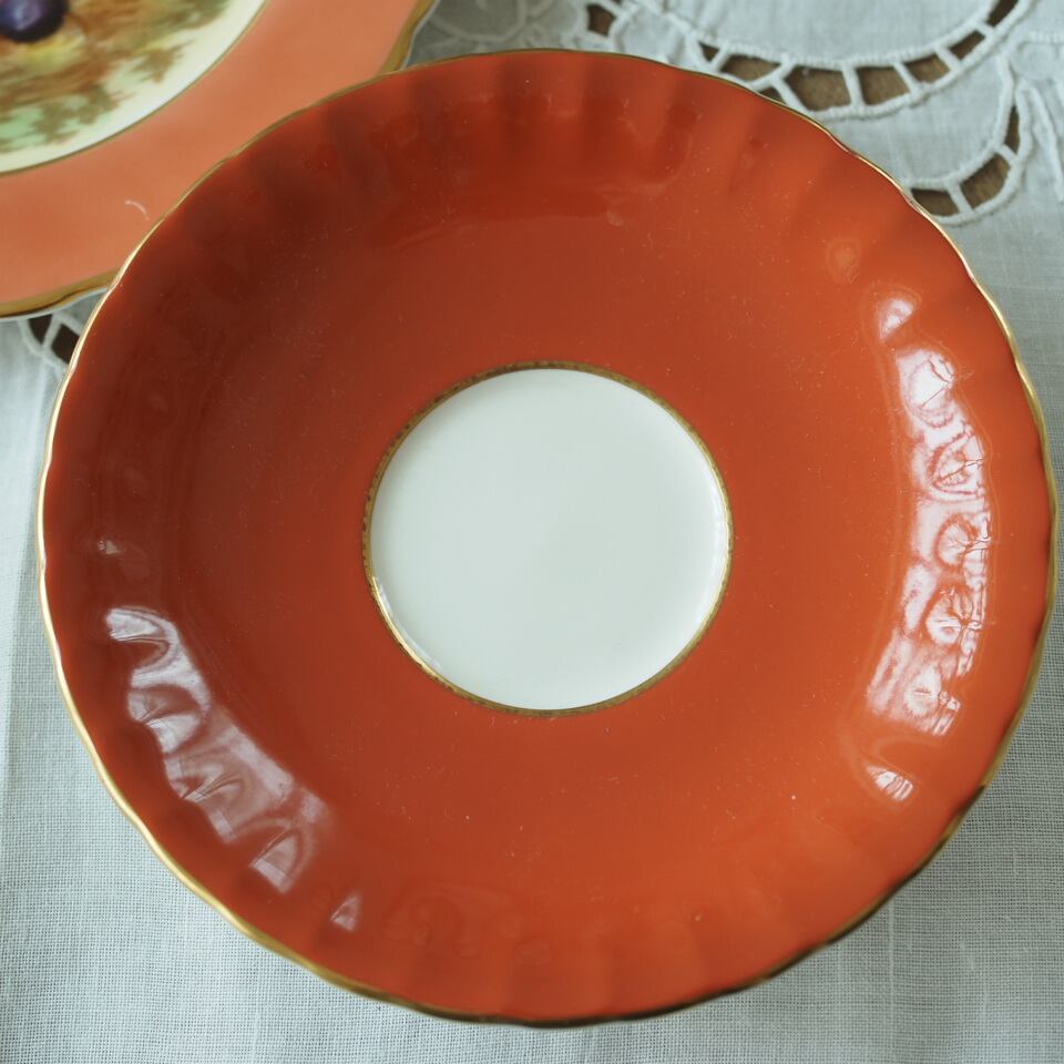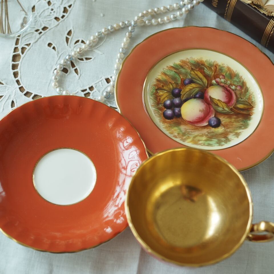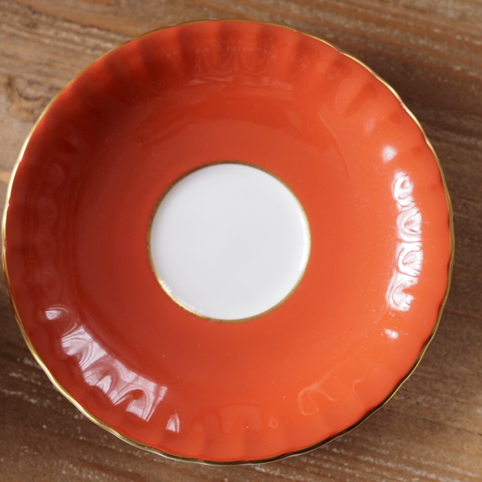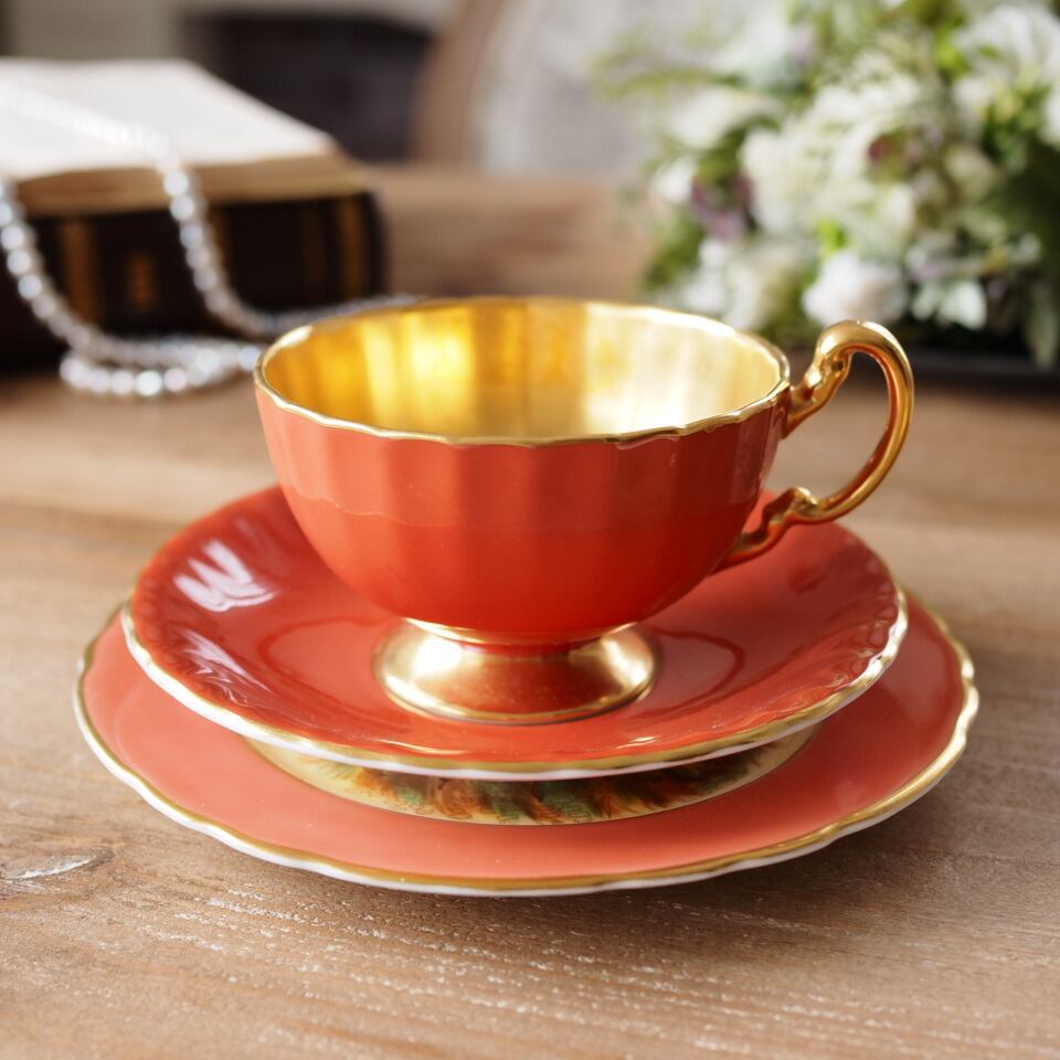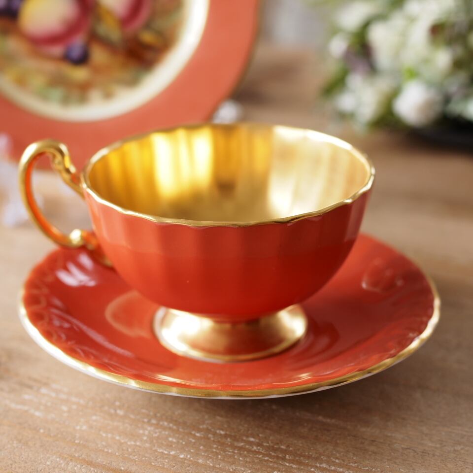 カップ&ソーサーはリッチなオレンジカラーに、たっぷりと金彩が施された内金貼り仕様。