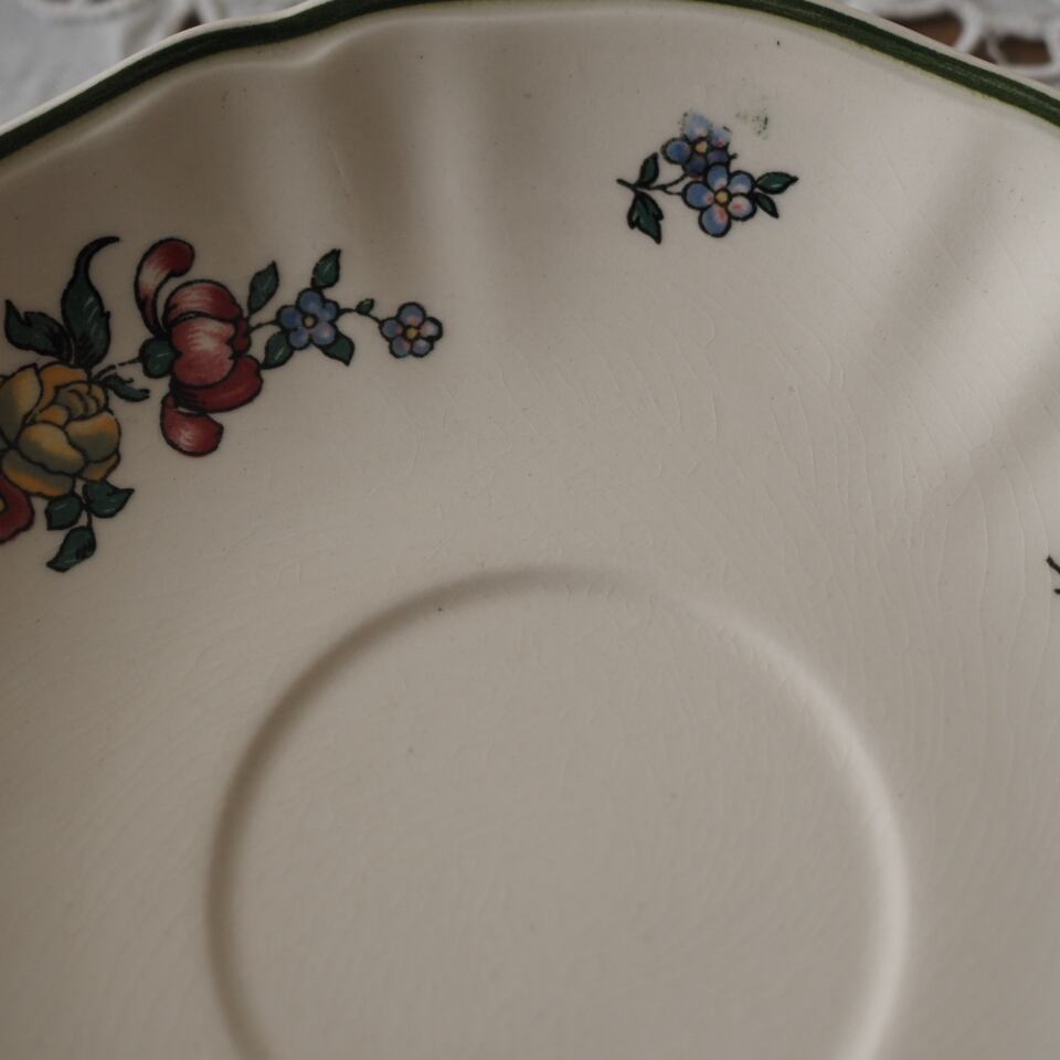 ソーサーには5ヶ所にわたって花柄が配置されており、どの角度から見ても華やかな印象に。お花の色や配置のバランスも絶妙で、テーブルコーディネートの主役になる存在感です。
