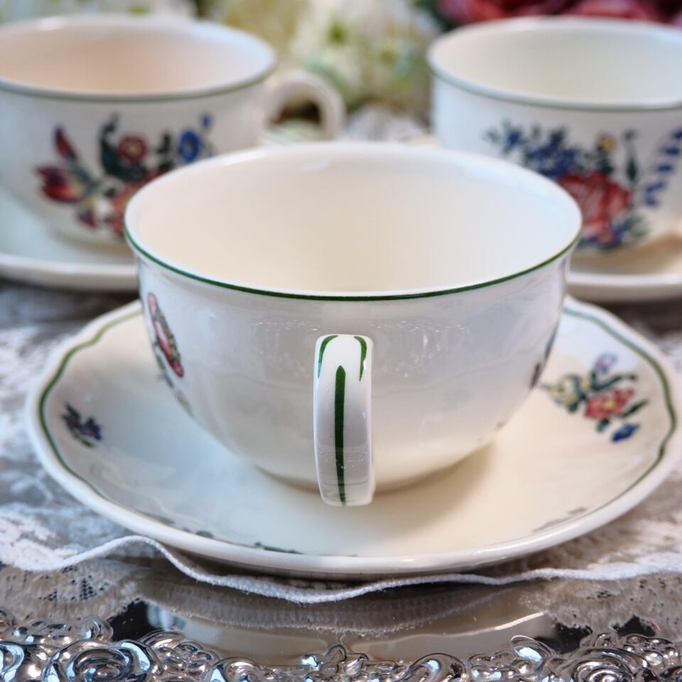 ソーサーには5ヶ所にわたって花柄が配置されており、どの角度から見ても華やかな印象に。お花の色や配置のバランスも絶妙で、テーブルコーディネートの主役になる存在感です。
