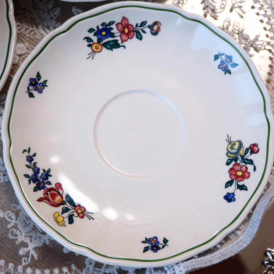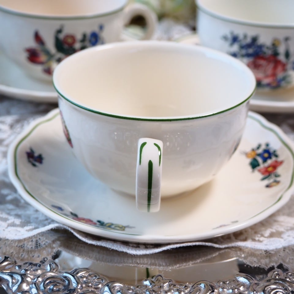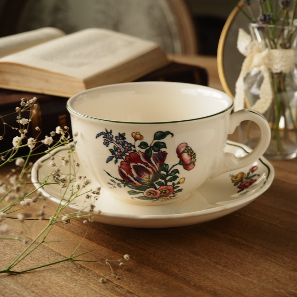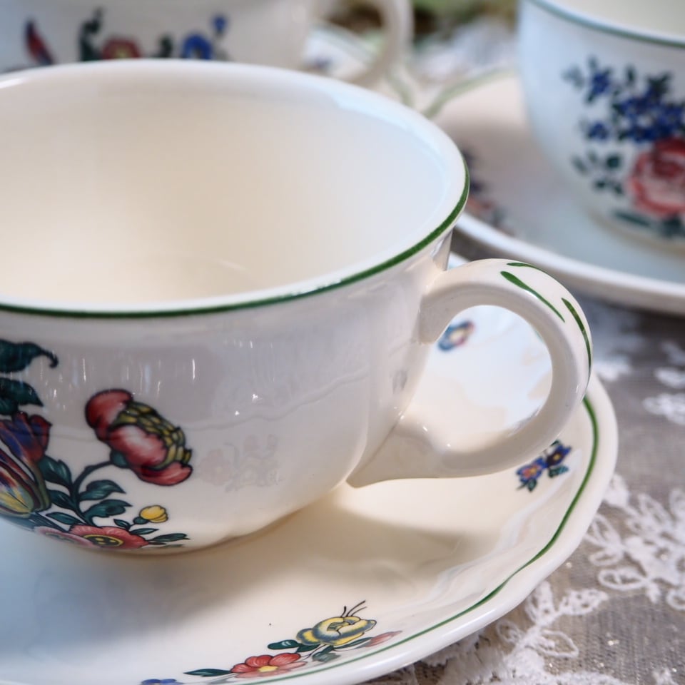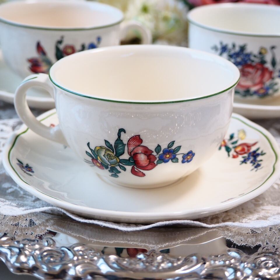 ソーサーには5ヶ所にわたって花柄が配置されており、どの角度から見ても華やかな印象に。お花の色や配置のバランスも絶妙で、テーブルコーディネートの主役になる存在感です。