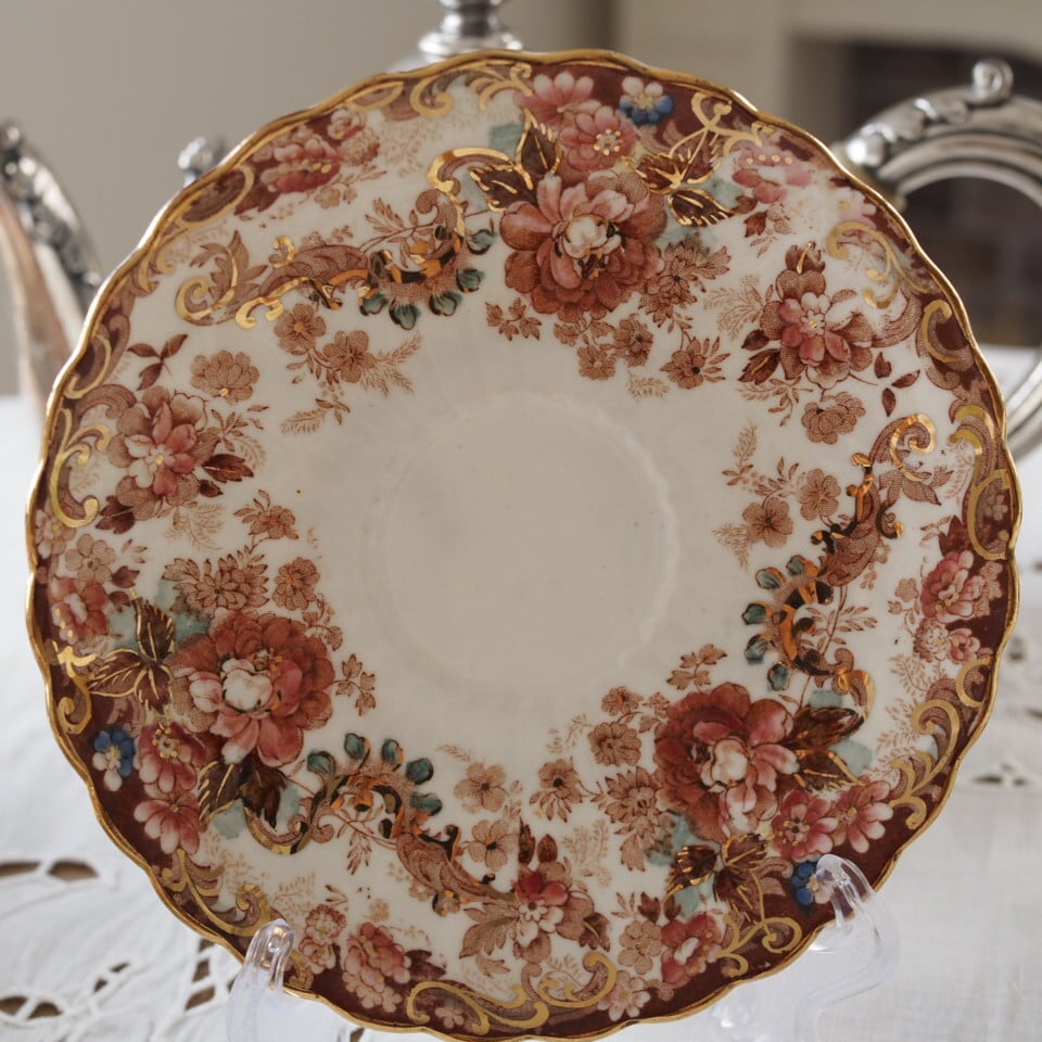 スカラップの縁取りや内側まで広がる装飾は、ラドフォードらしい華麗な意匠の特徴です。コレクションとしてはもちろん、特別なティータイムにも映えるお品です。