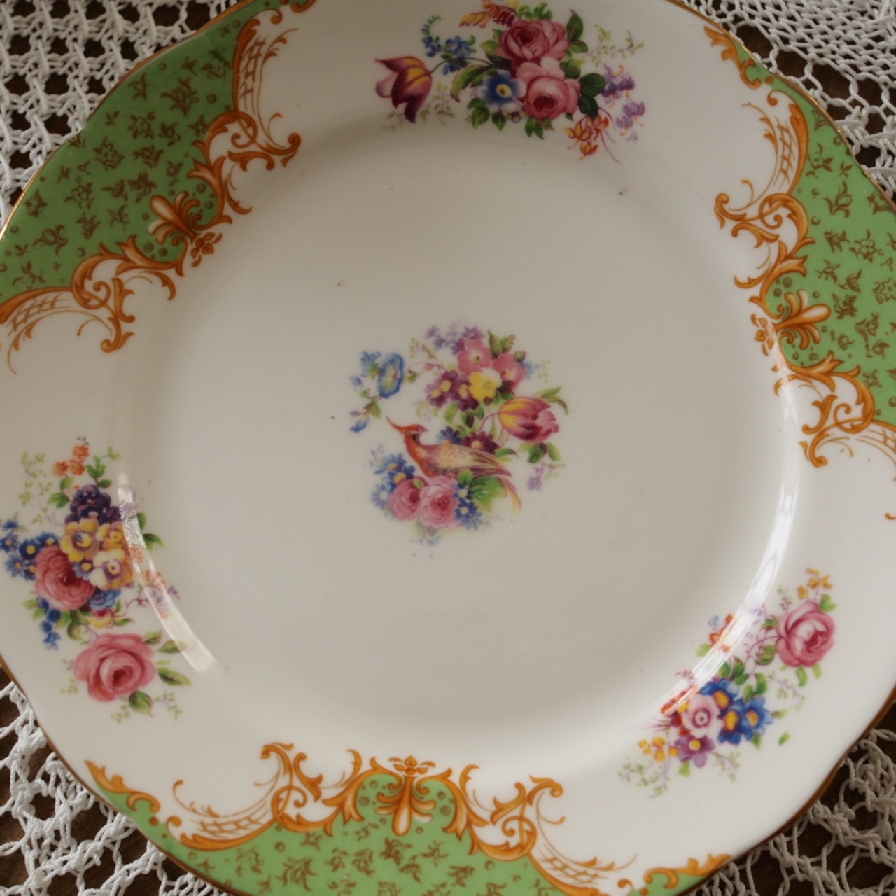 「ロッキンガム」とは、英国陶磁器の歴史の中でも伝統的な名を冠したシリーズ名で、パラゴンの中でもエレガントで格式を感じさせるデザインが魅力。こちらはグリーンベースのタイプで、深みのある色合いと煌びやかな金彩の組み合わせが際立ちます。