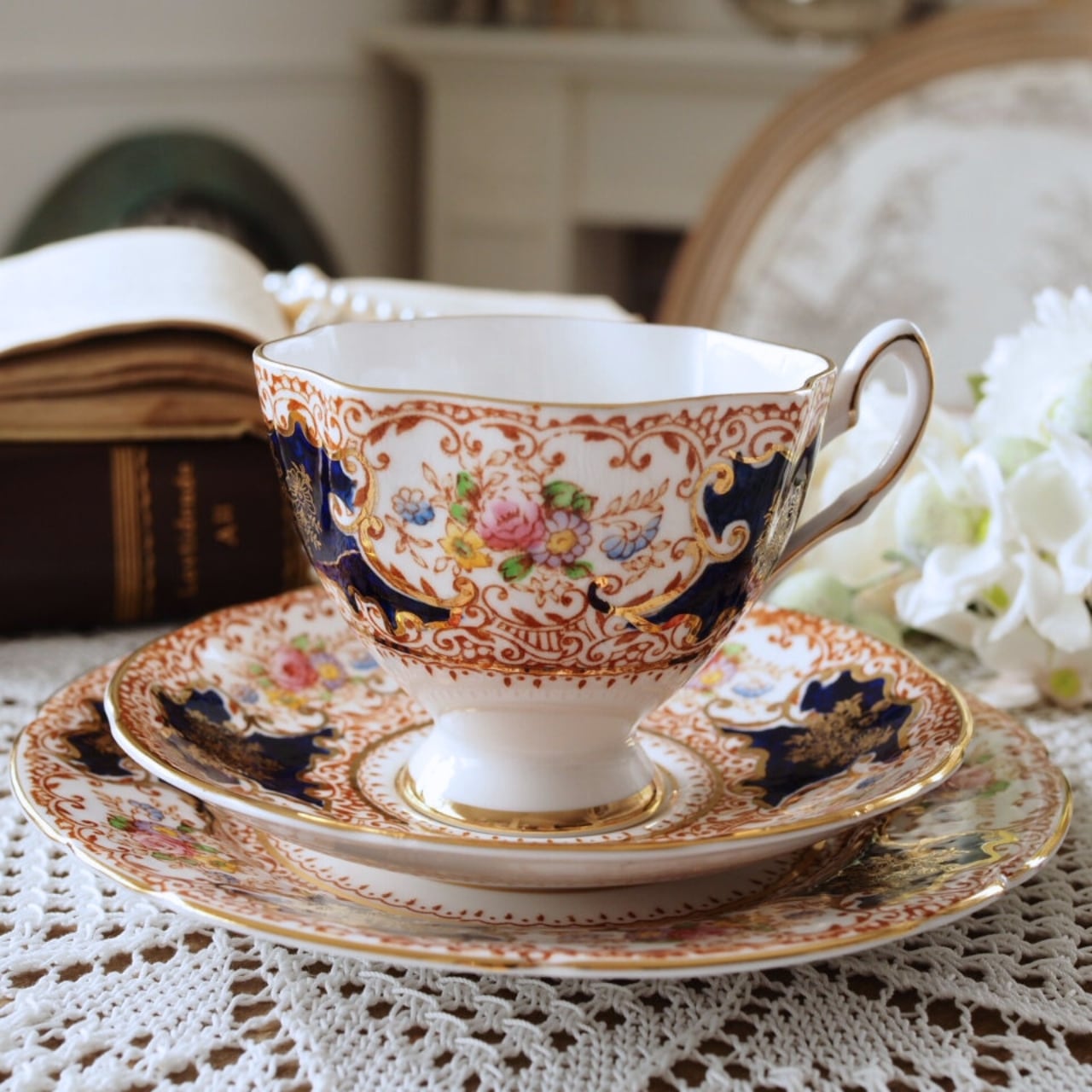 限定1客 英国ソールズベリー コバルトと花柄が素敵なトリオ カップソーサー