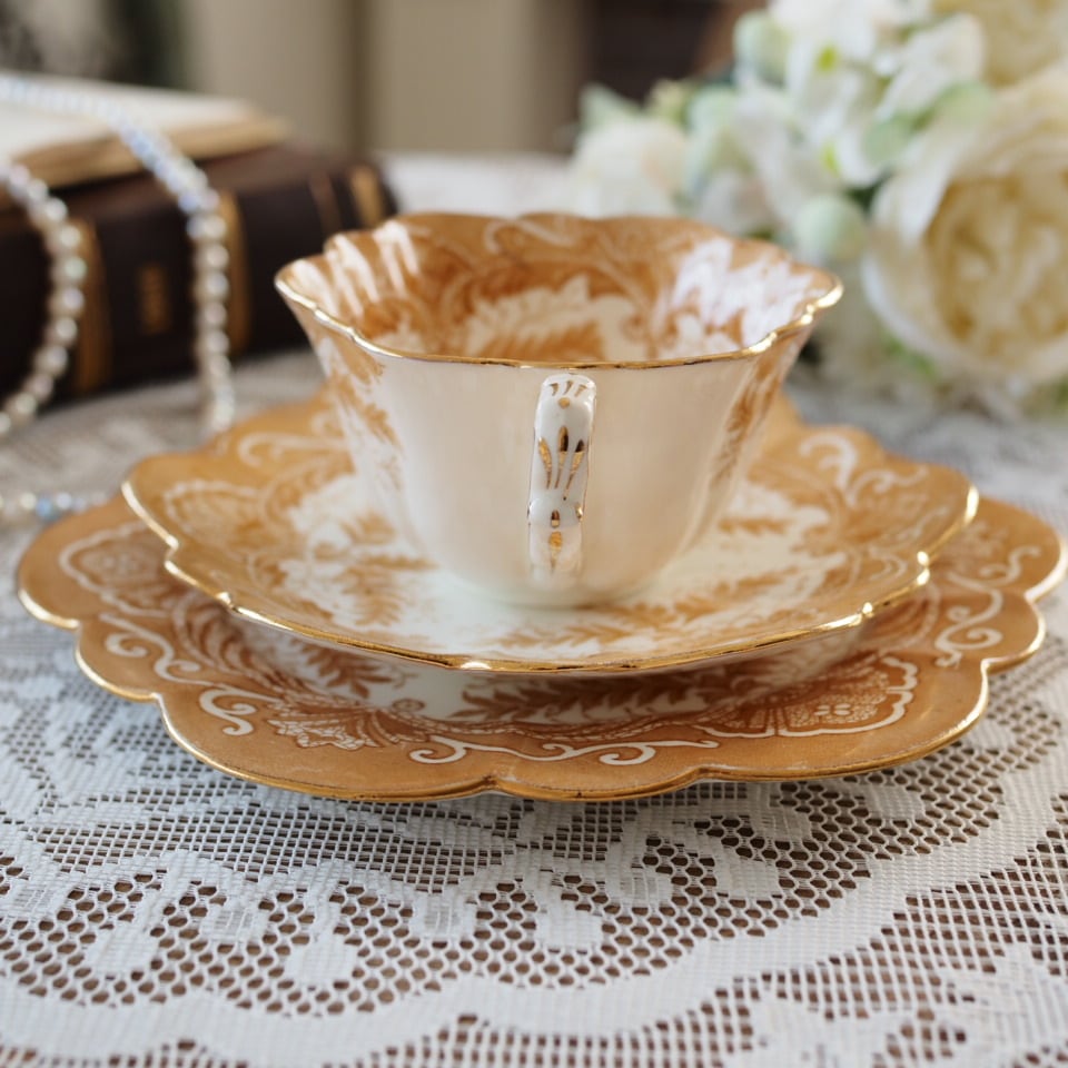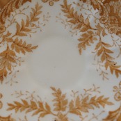 白地に繊細な茶色のシダ模様が描かれ、カップ内側にも続く優雅なデザイン。金彩の縁取りがアンティークらしい気品を添えています。