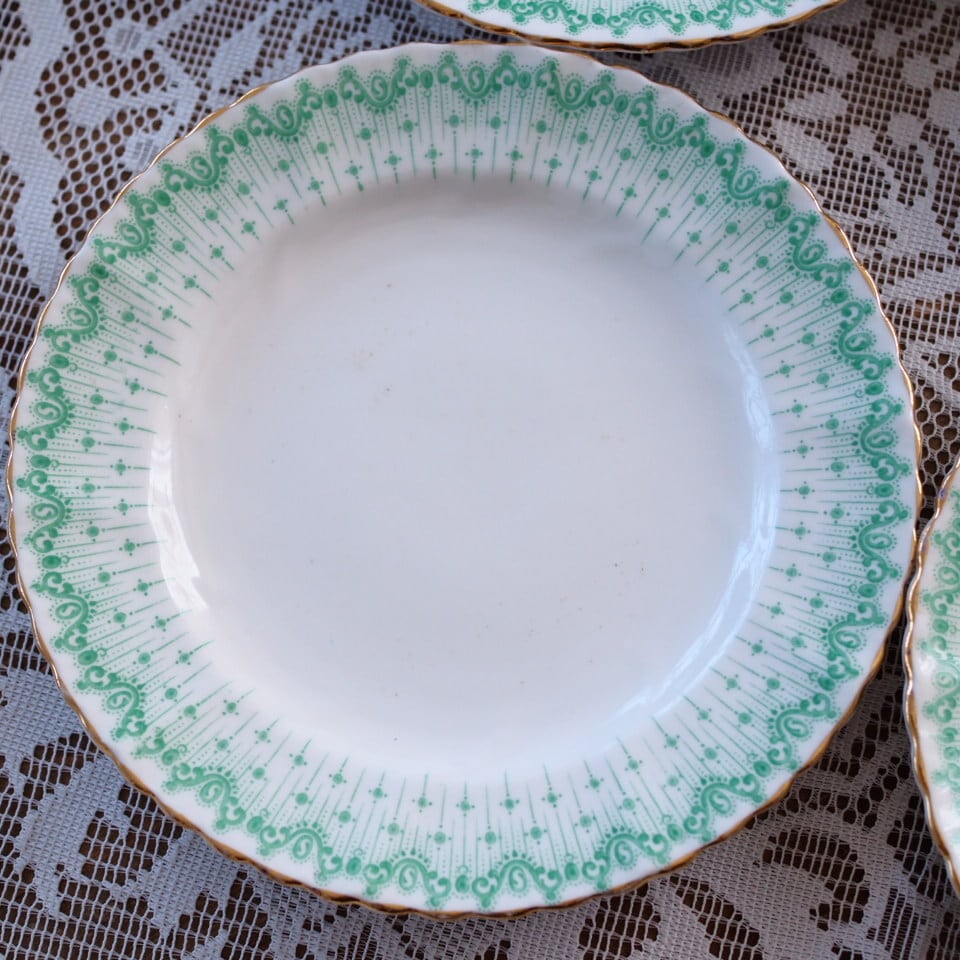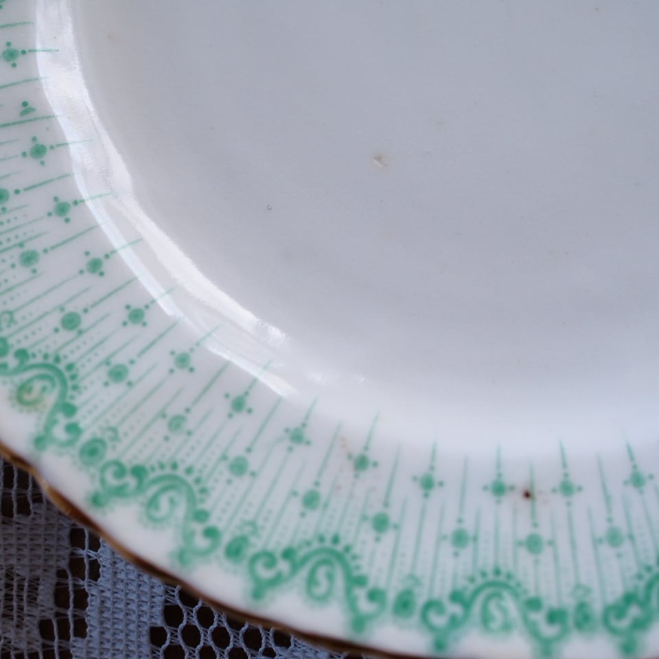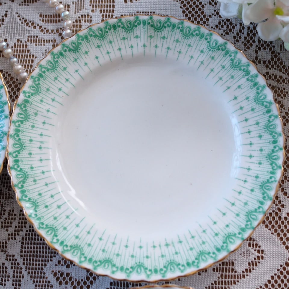 ふんわりとしたグリーンの絵柄が広がり、縁を囲む金彩が静かに輝く──