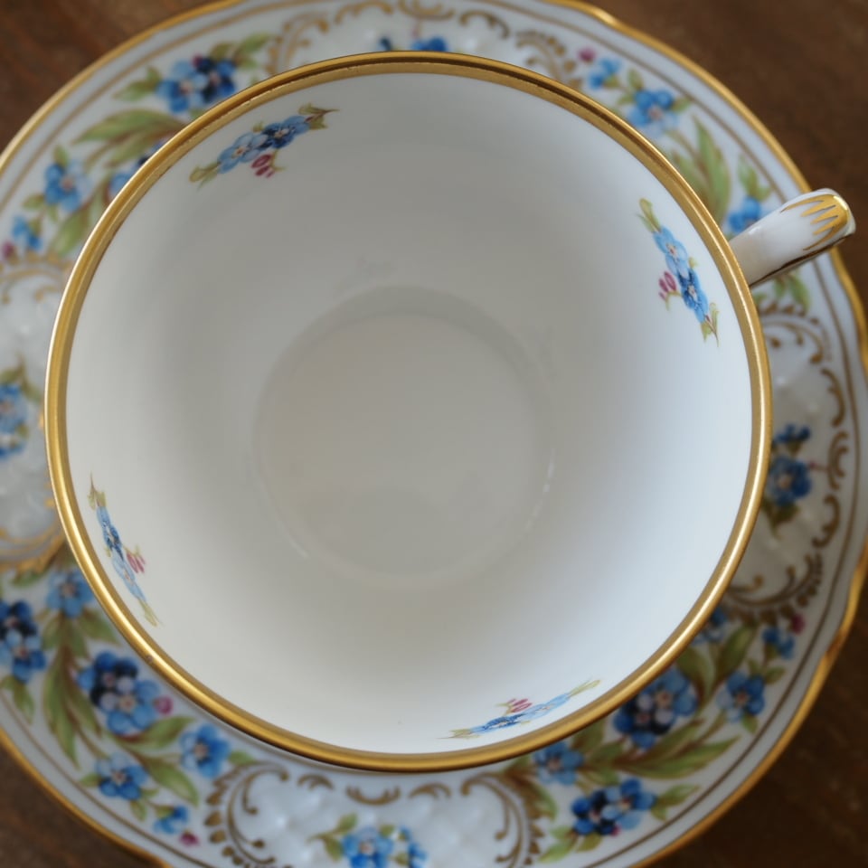 鮮やかなブルーの勿忘草が丁寧に描かれたカップ&ソーサーは、上品で落ち着いた雰囲気を演出してくれます。勿忘草の愛らしい花柄は、時代を超えて愛され続けるクラシックな魅力を持ちながらも、どこか新鮮さを感じさせます。