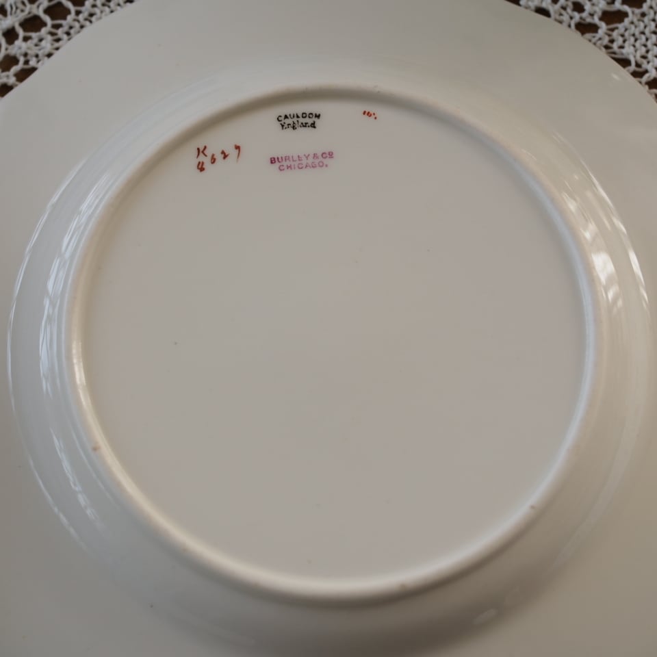 イギリスの名窯「Cauldon(コウルドン)」と、アメリカ・シカゴの老舗輸入業者「Burley & Co」のダブルネームが入った、希少なヴィンテージのプレート4枚セットです。
