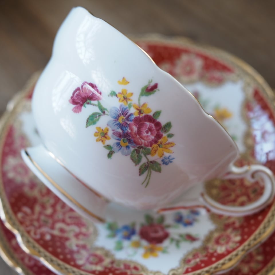 カラフルなブーケと繊細なレースが彩られ、可愛らしさと大人っぽさを兼ね備えたとても素敵なティーカップのトリオです☆