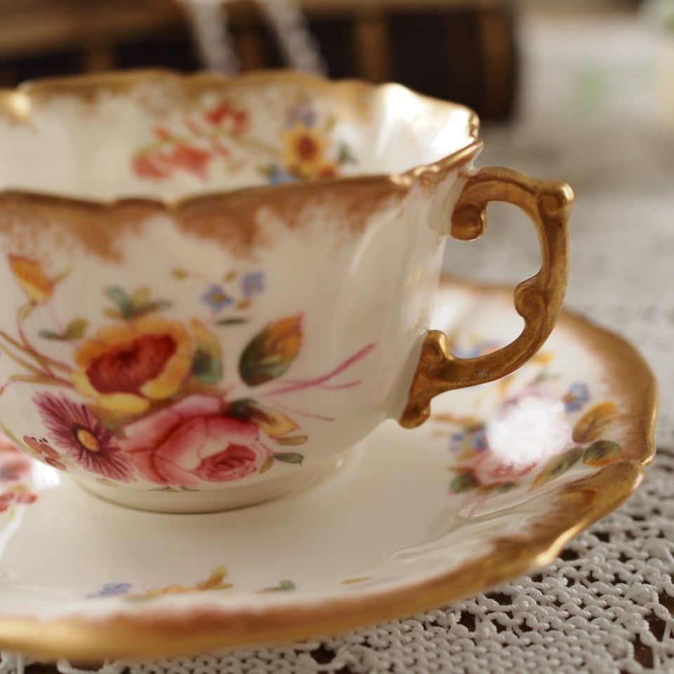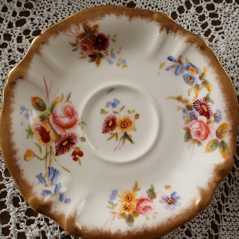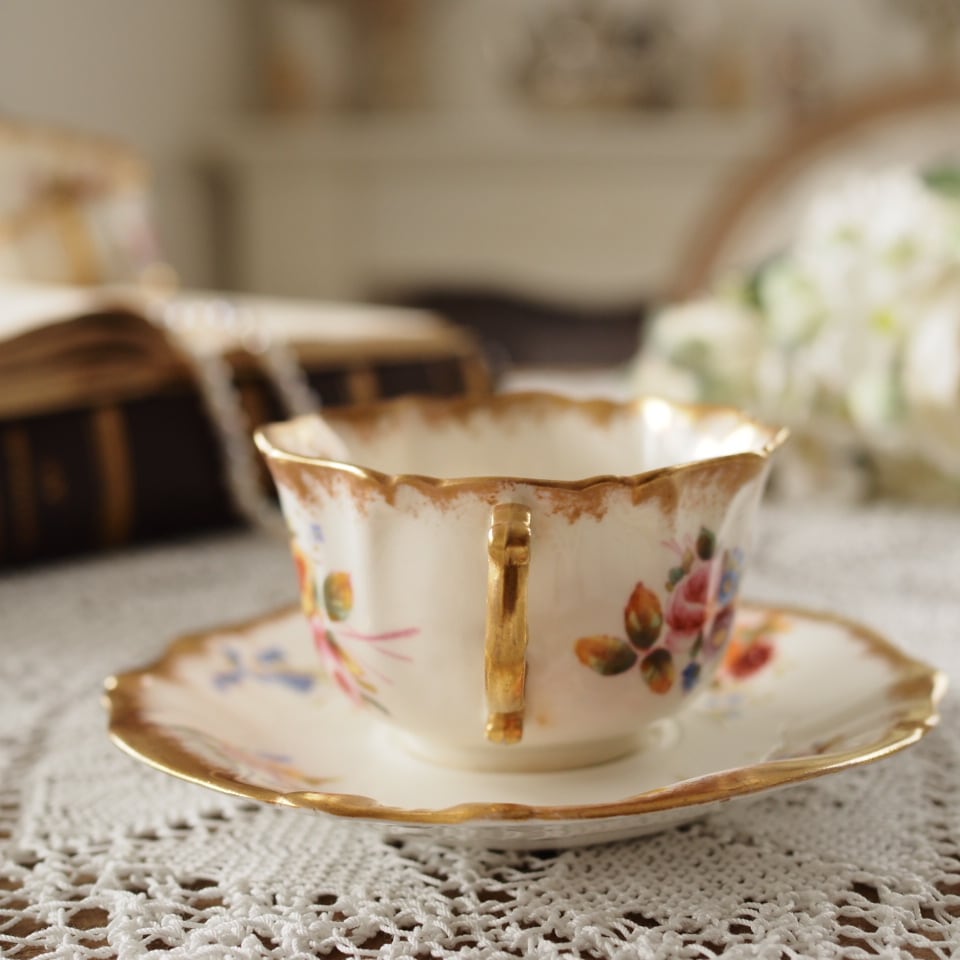 アイボリー地に、ピンクローズやブルーベルなど色とりどりの花々が手描きで描かれ、縁にはたっぷりとした金彩があしらわれています。