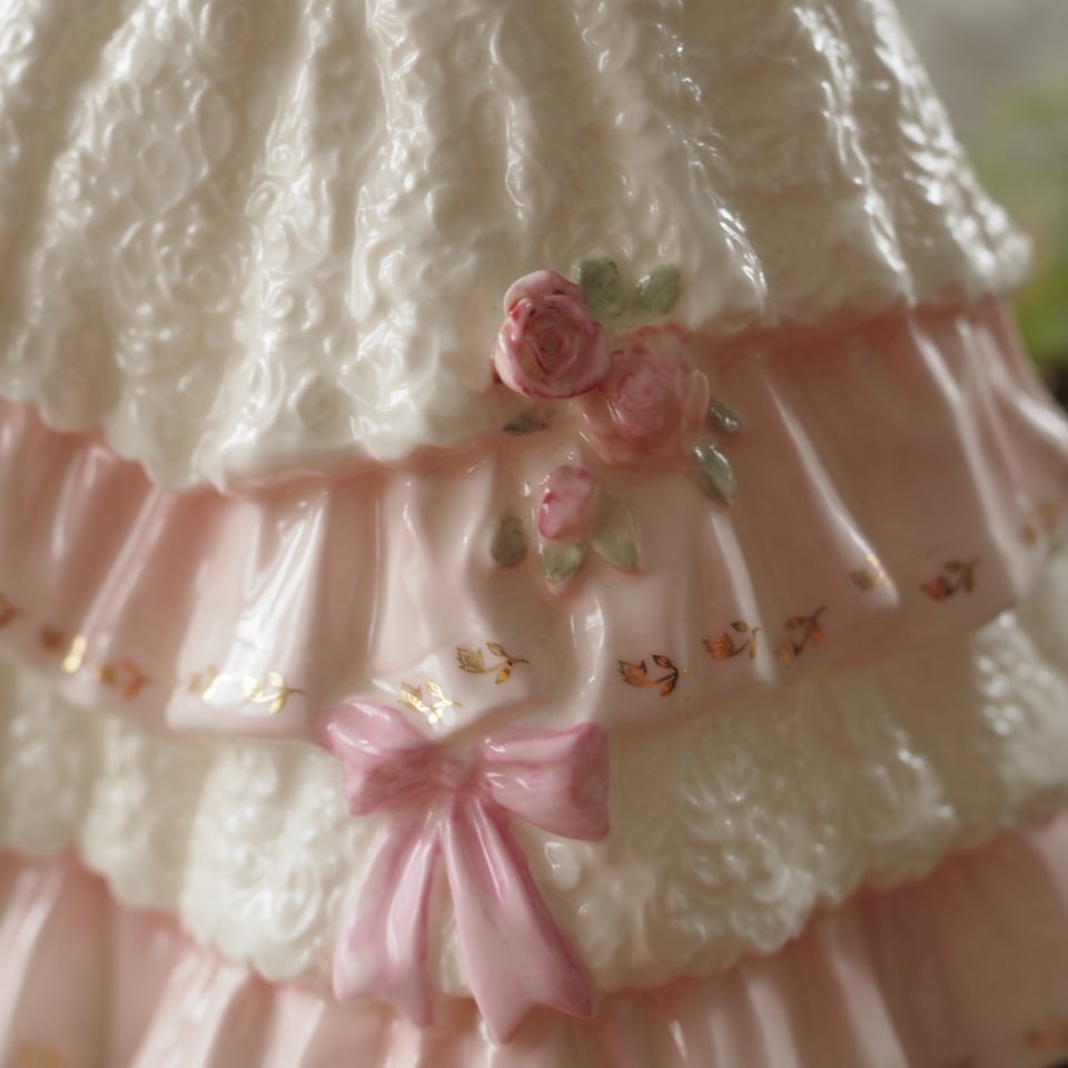 ふんわりと広がる三段のドレス、胸元のピンクのリボン、立体的な薔薇の装飾──