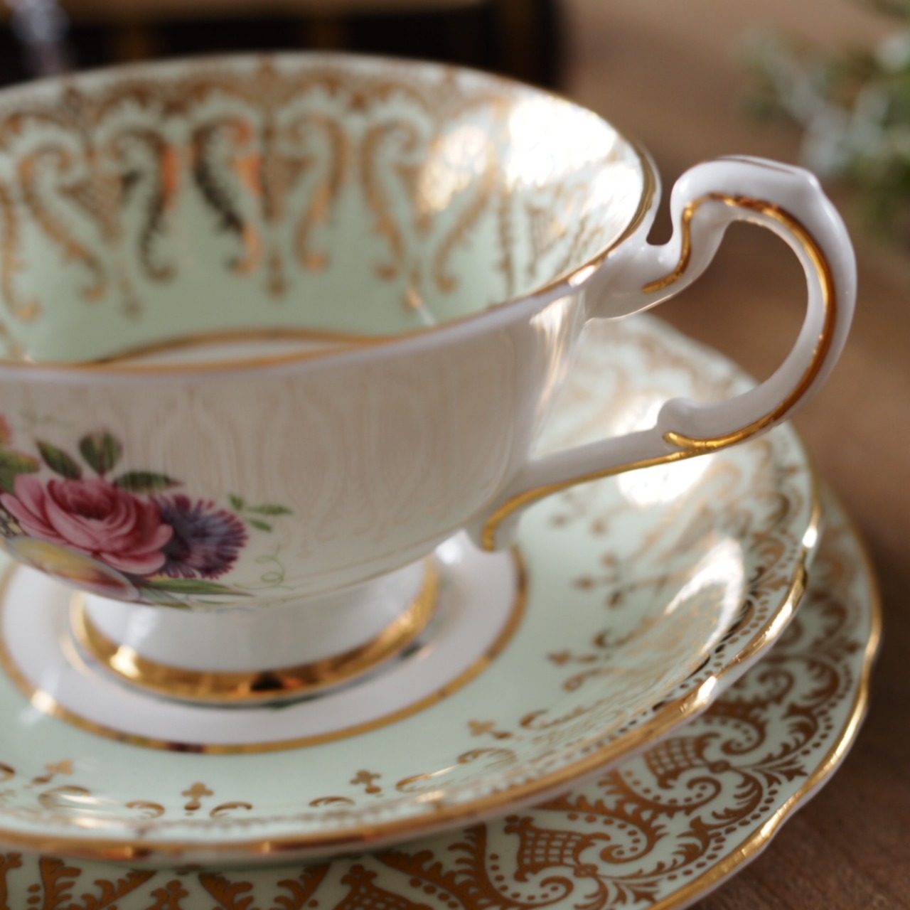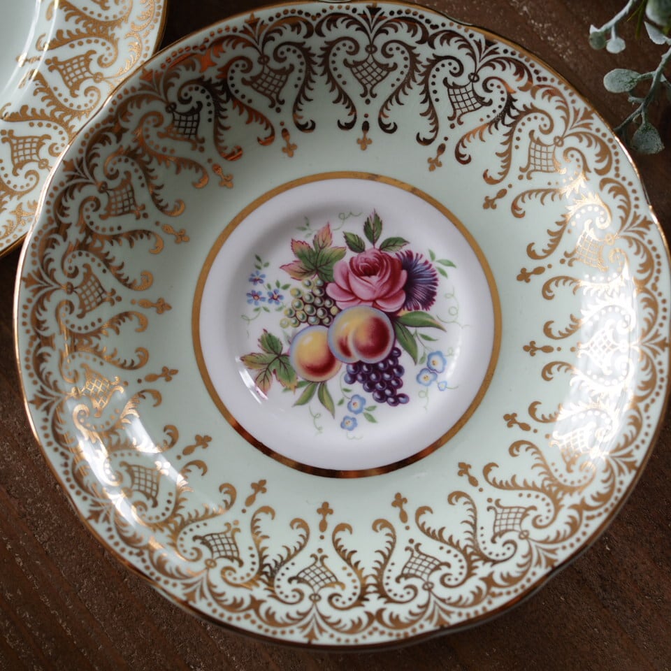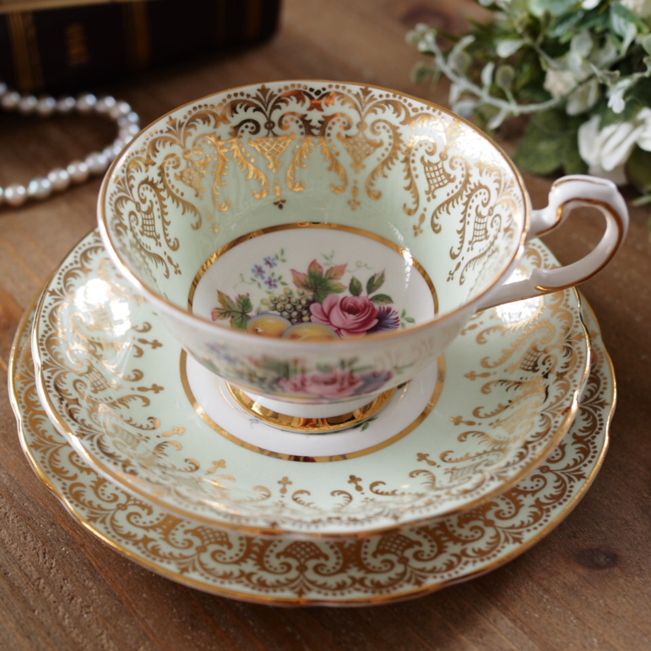 英国パラゴン 金彩果実文 フルーツ絵柄トリオ グリーン カップ&ソーサー F7