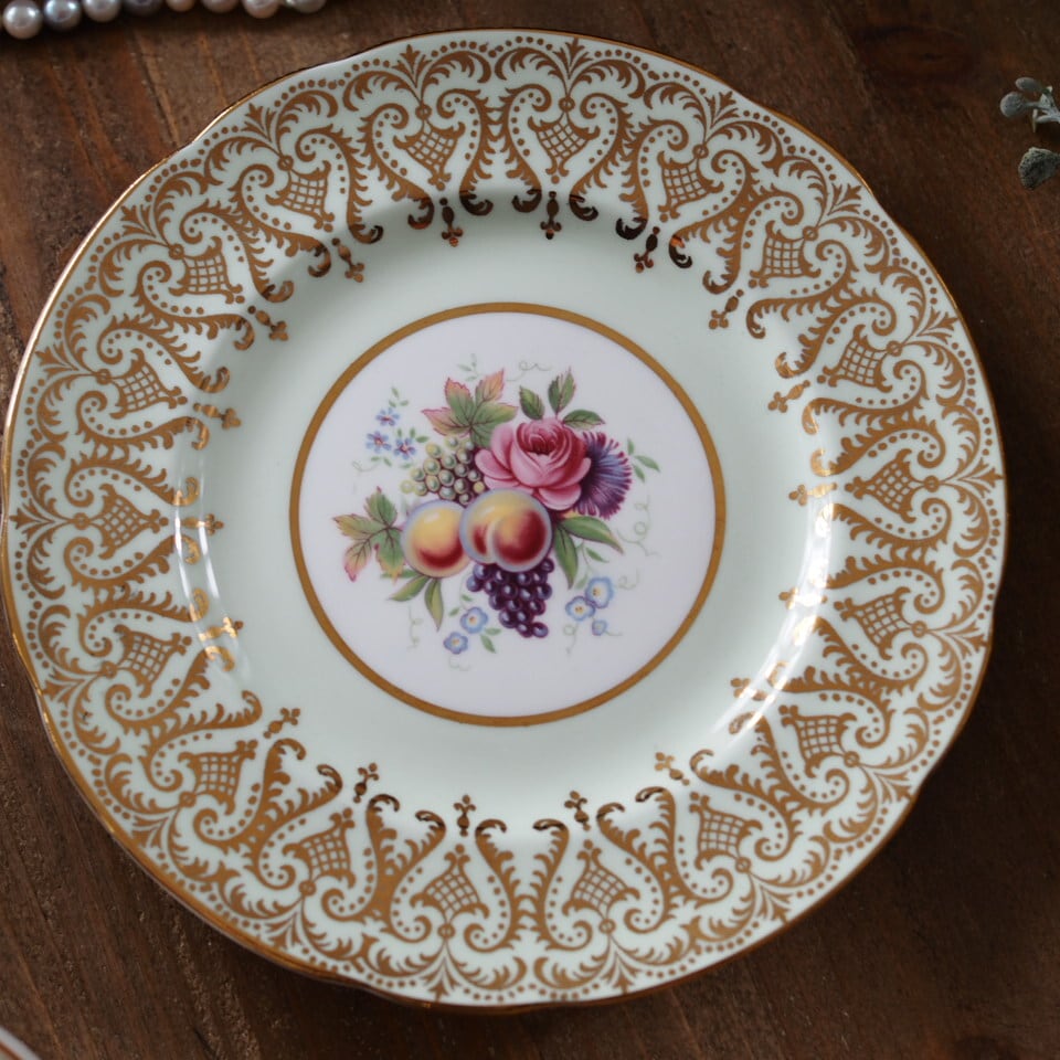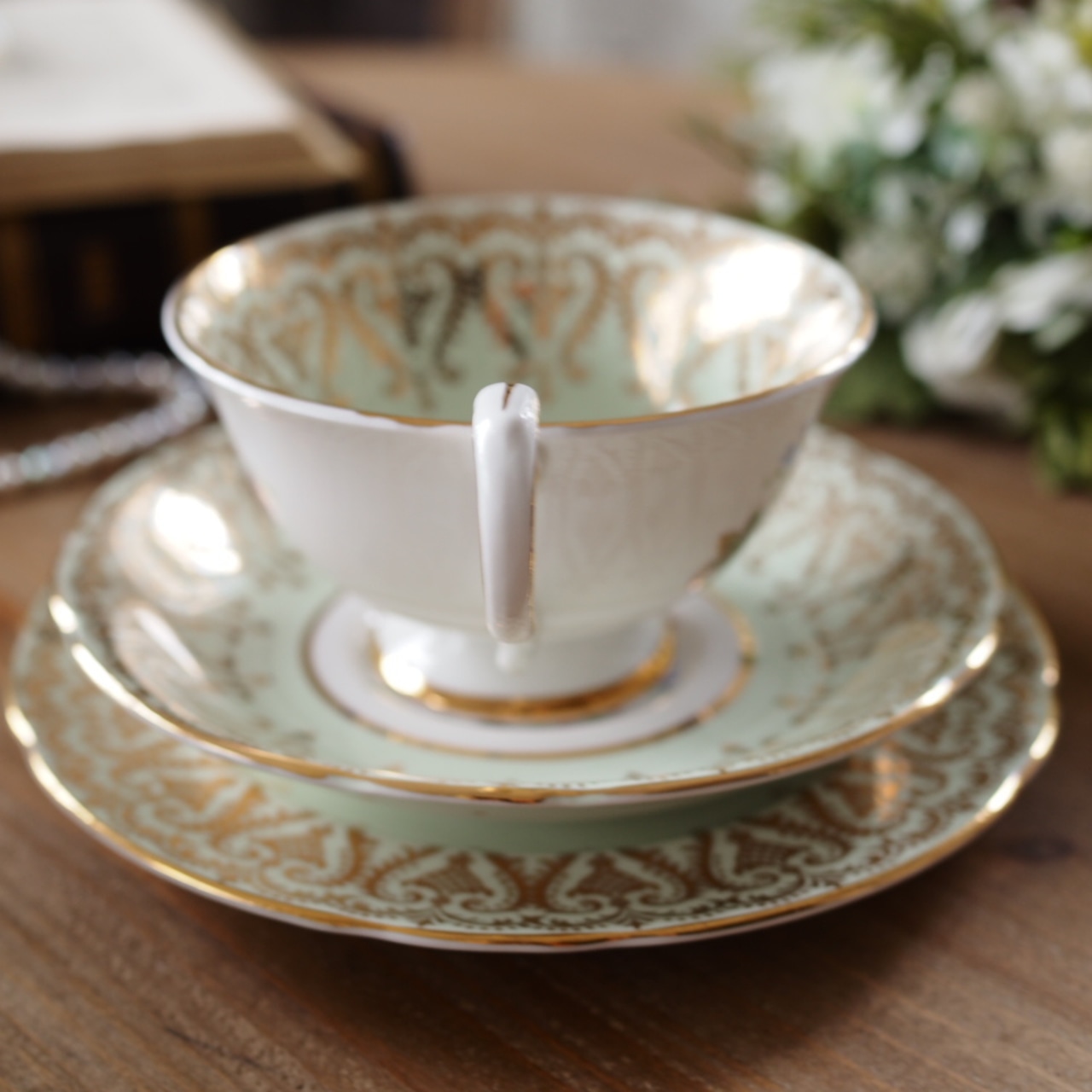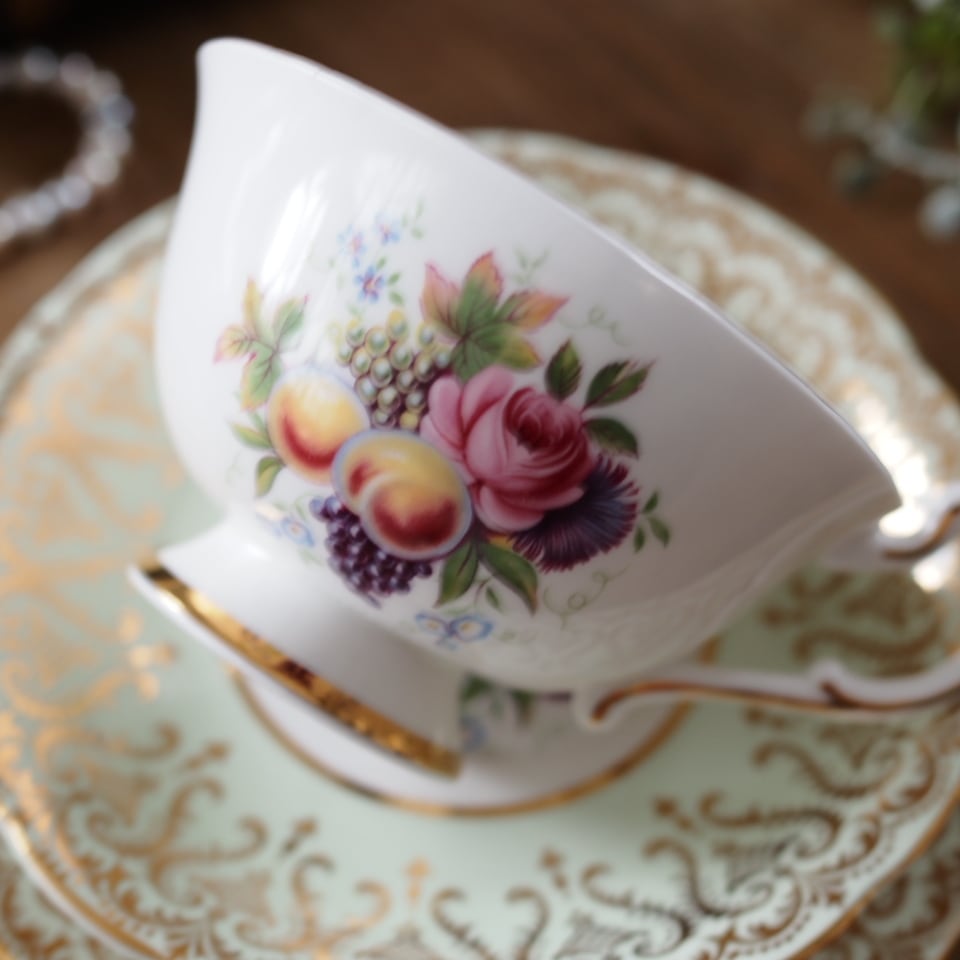 英国パラゴン 金彩果実文 フルーツ絵柄トリオ グリーン カップ&ソーサー F7
