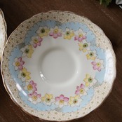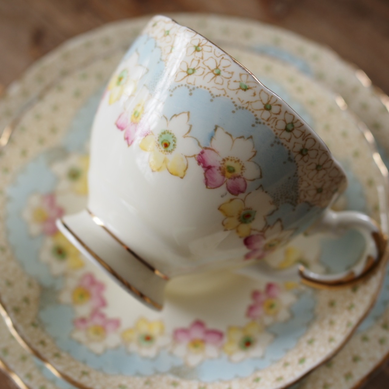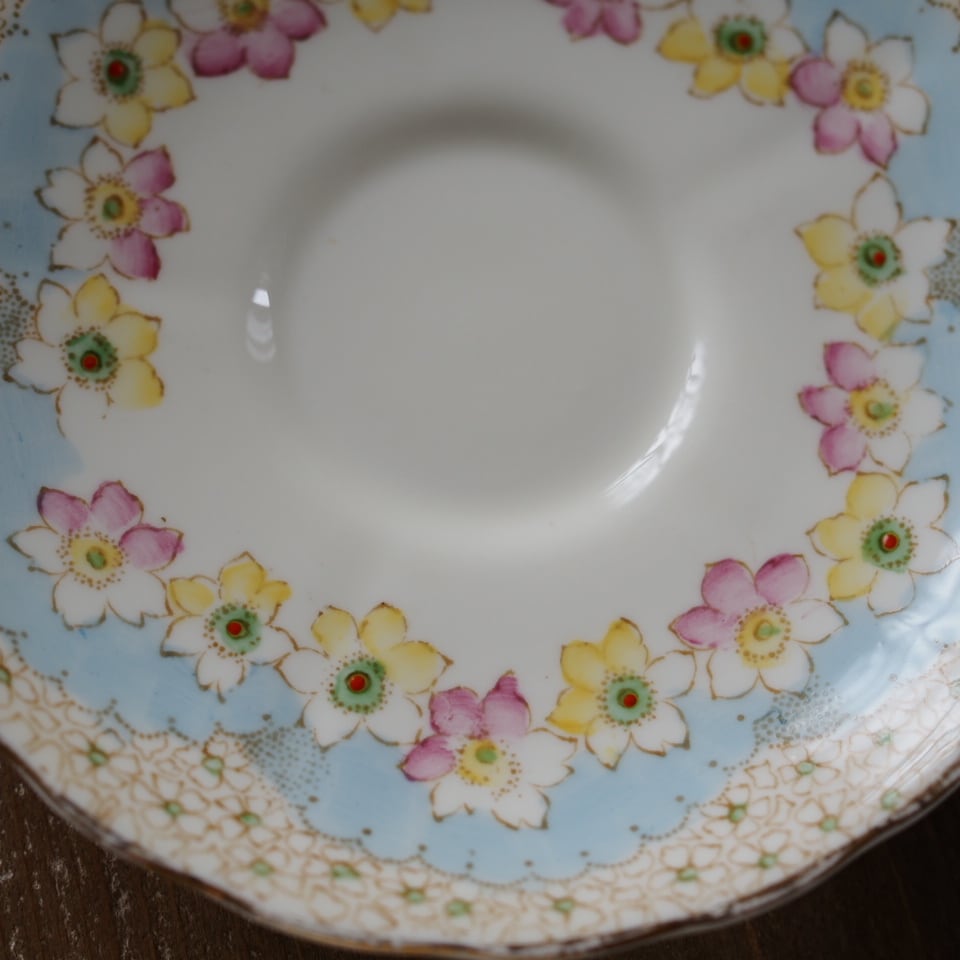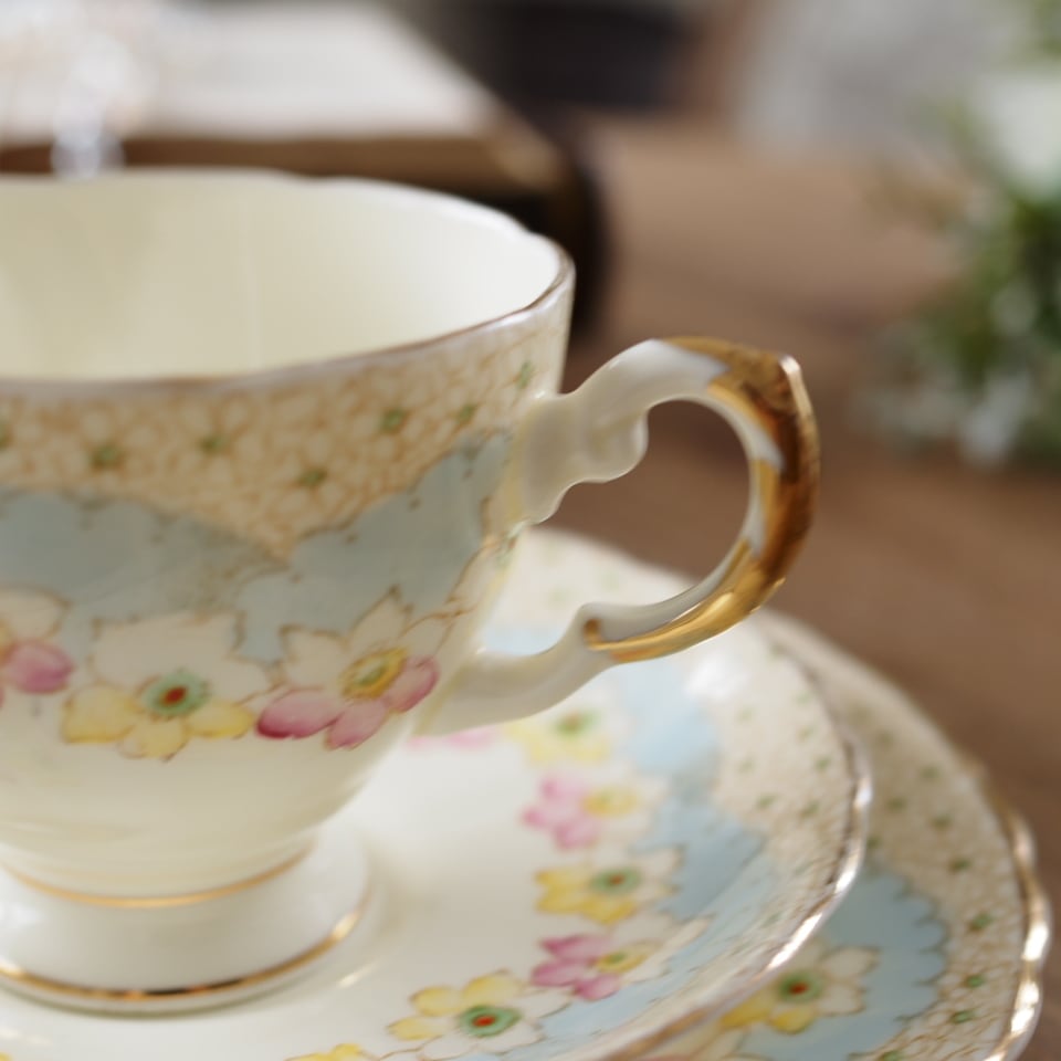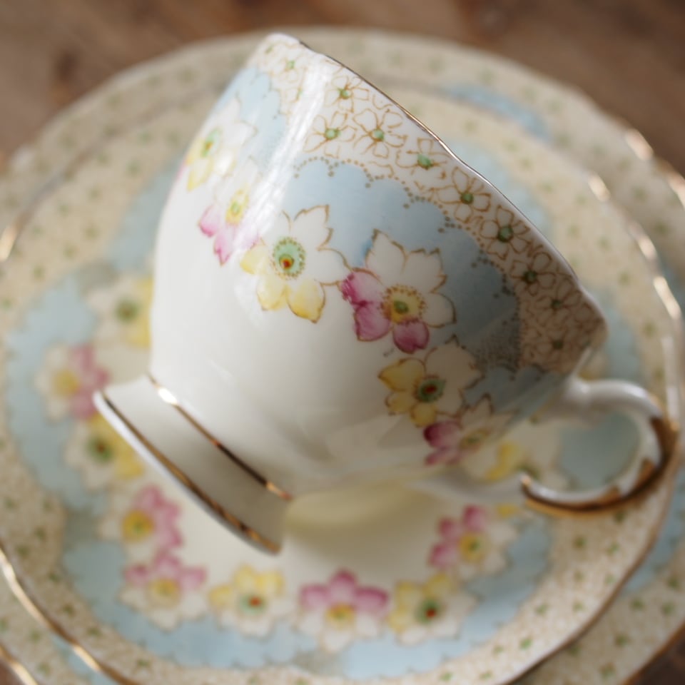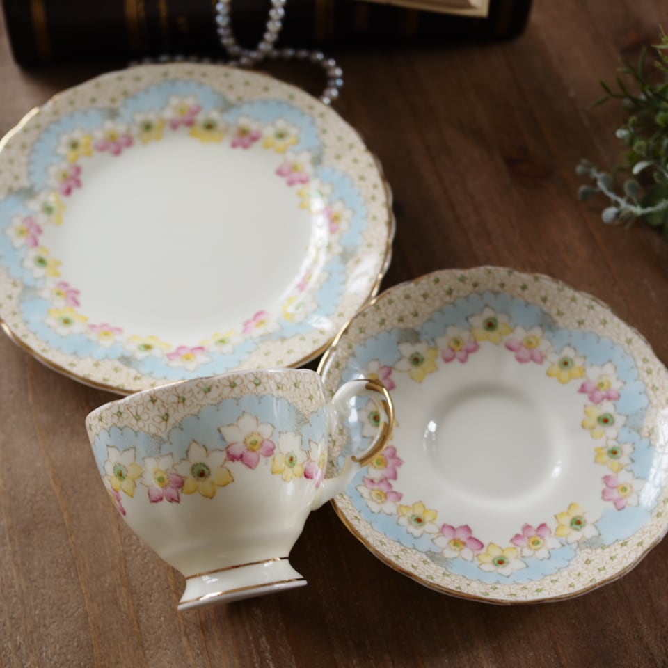 【美品】英国アンティーク TUSCAN パステルブルー フラワー トリオ カップ&ソーサー F2