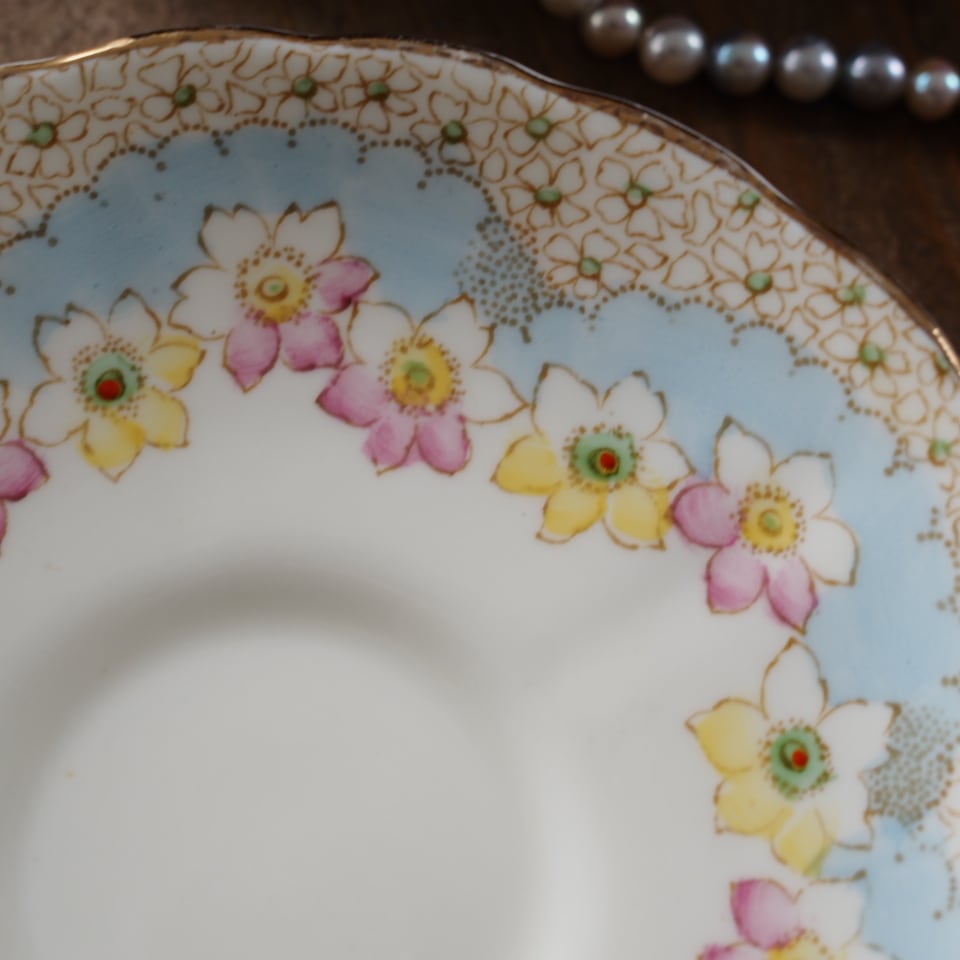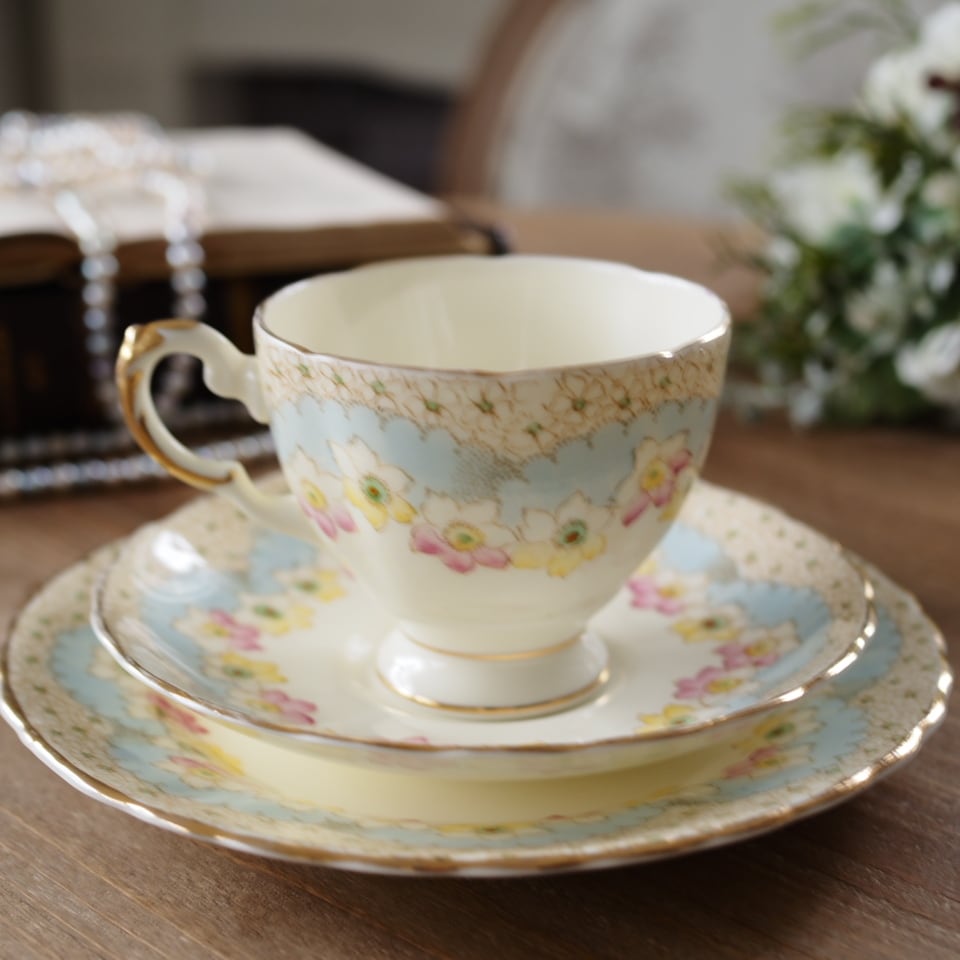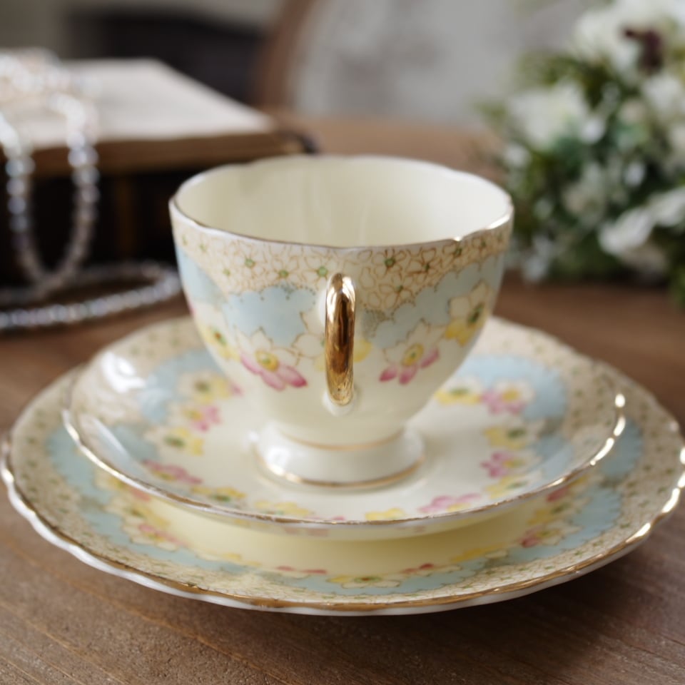 淡いクリーム色の地にパステルブルーと可憐な花々が美しく調和したアンティークトリオです。