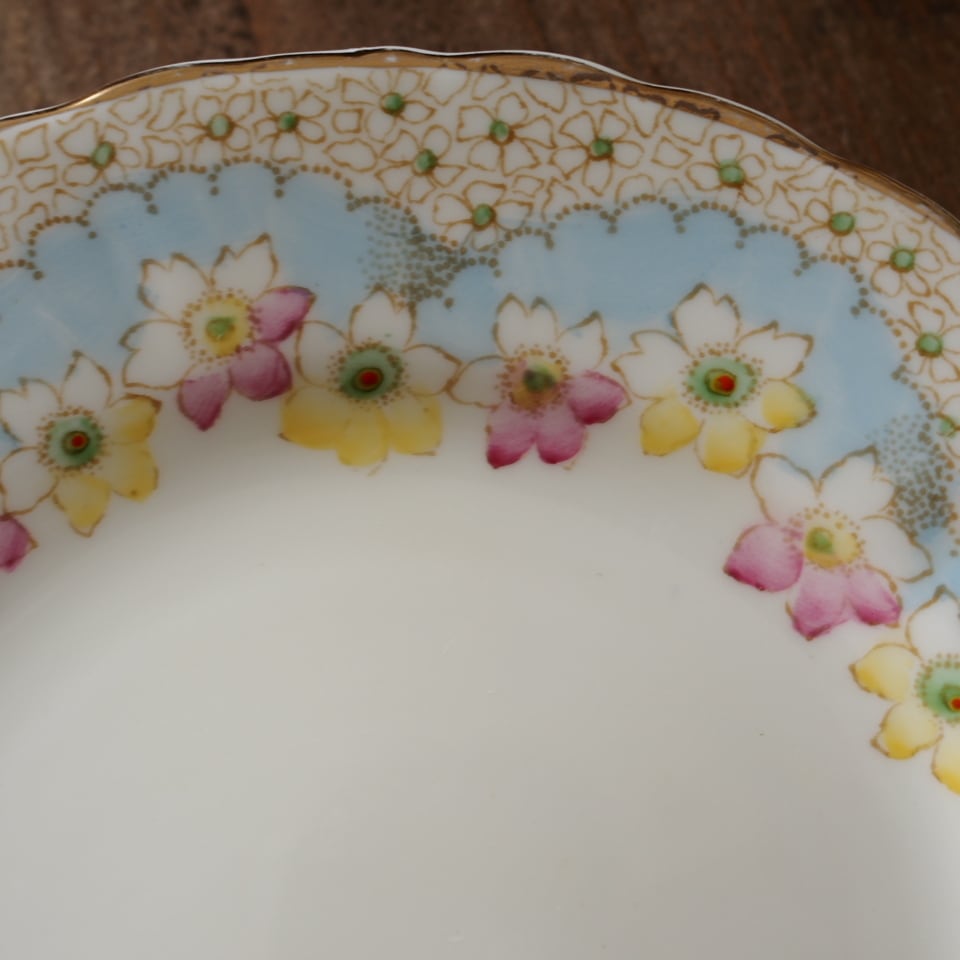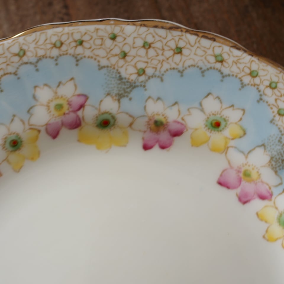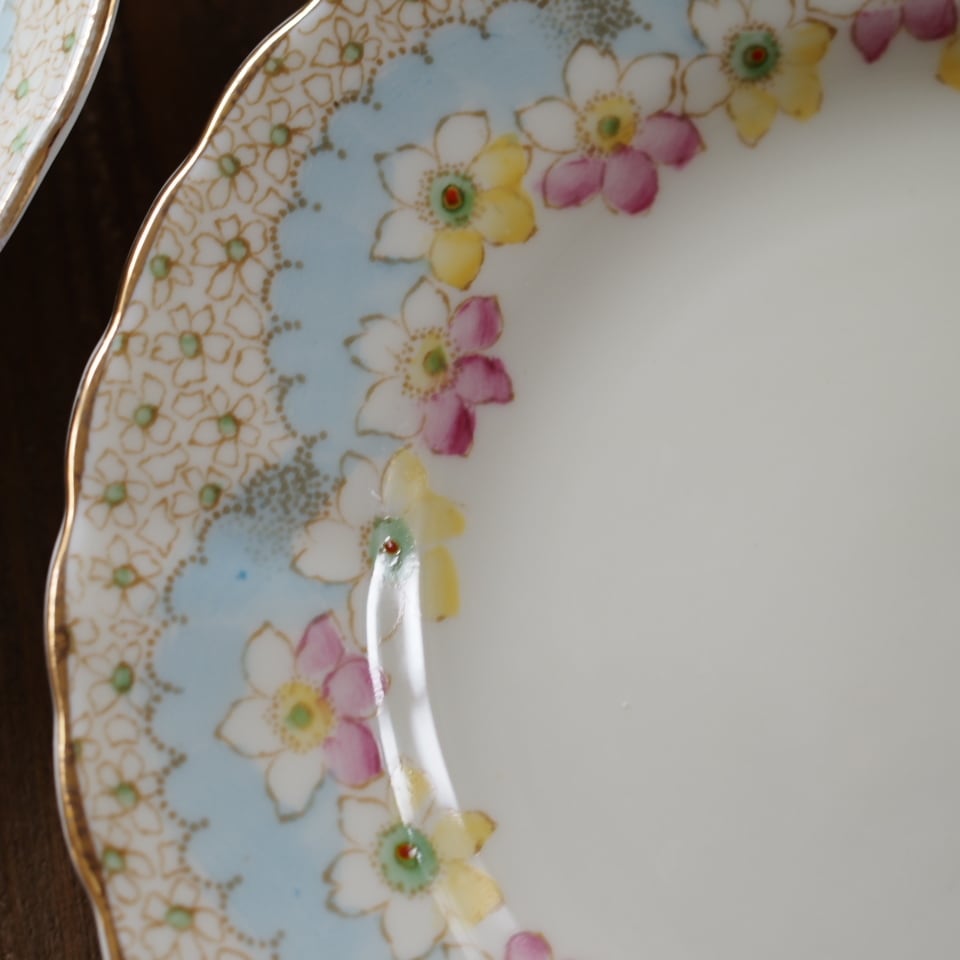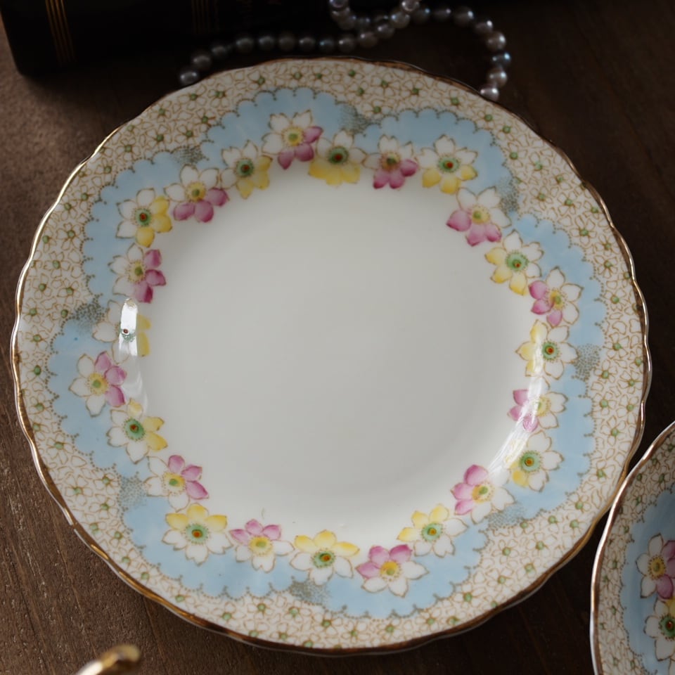 淡いクリーム色の地にパステルブルーと可憐な花々が美しく調和したアンティークトリオです。