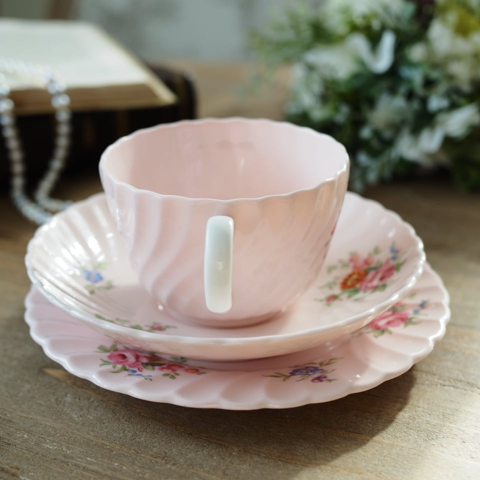 カップ、ソーサー、プレートすべてが美しいロゼッタピンクで統一されています。繊細な花柄の装飾とホワイトのハンドルが、ミントンならではの気品を漂わせています。