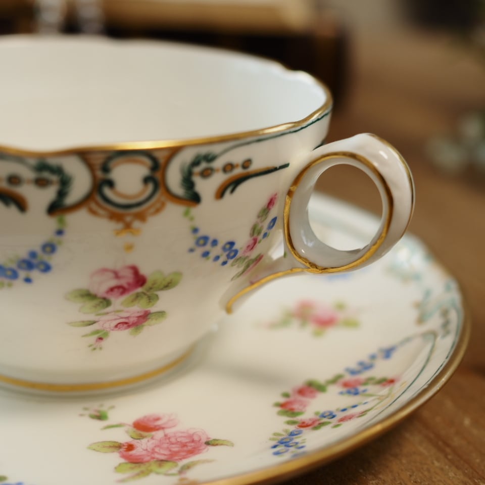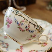 縁やハンドルには金彩が施され、甘さの中に気品を感じるミントンらしいデザインです。
