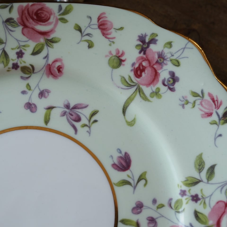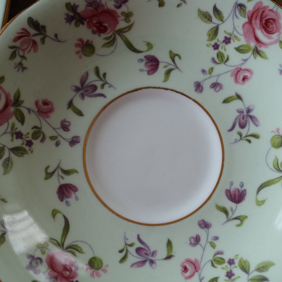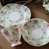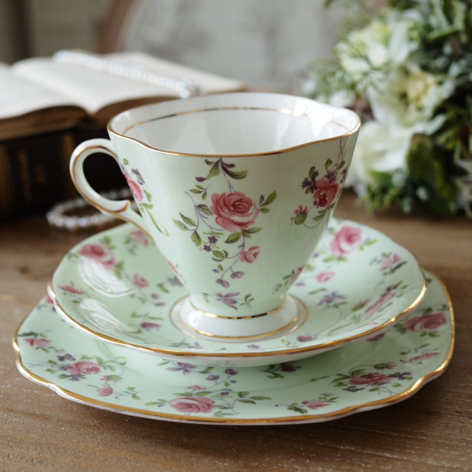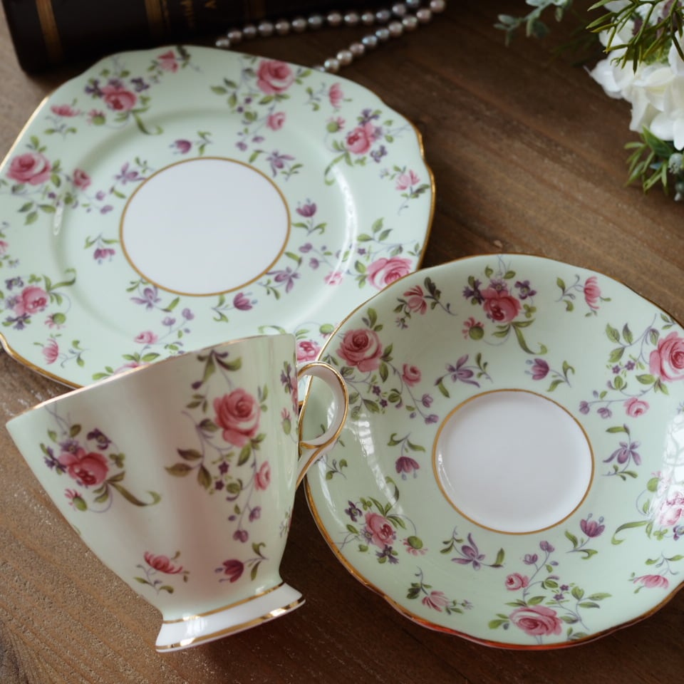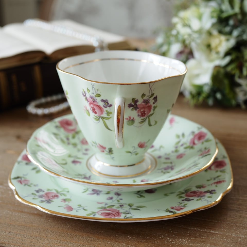 このWINDSOR社のトリオは、淡いミントグリーンにローズとスミレが寄り添う、まさに調和を象徴する一客です。1950年代、英国の家庭に良質な美を届けるために作られたこの器は、華美すぎない上品さと、日常を彩る確かな品質を兼ね備えています。