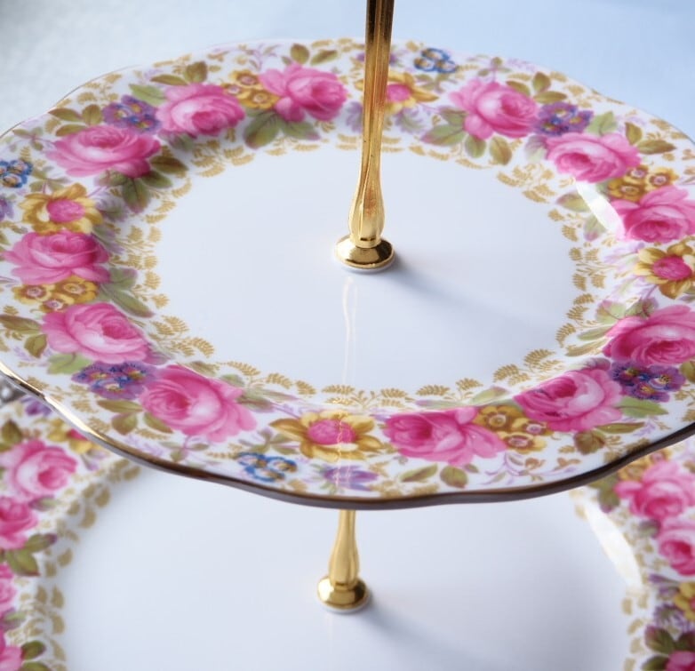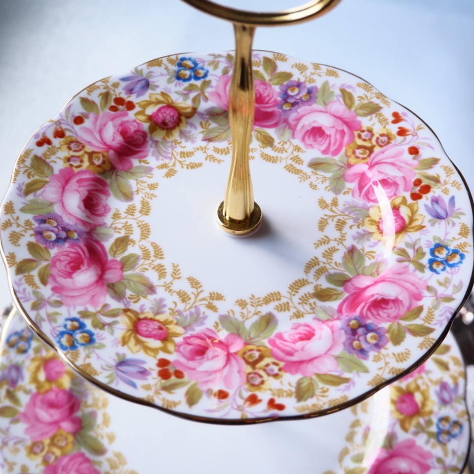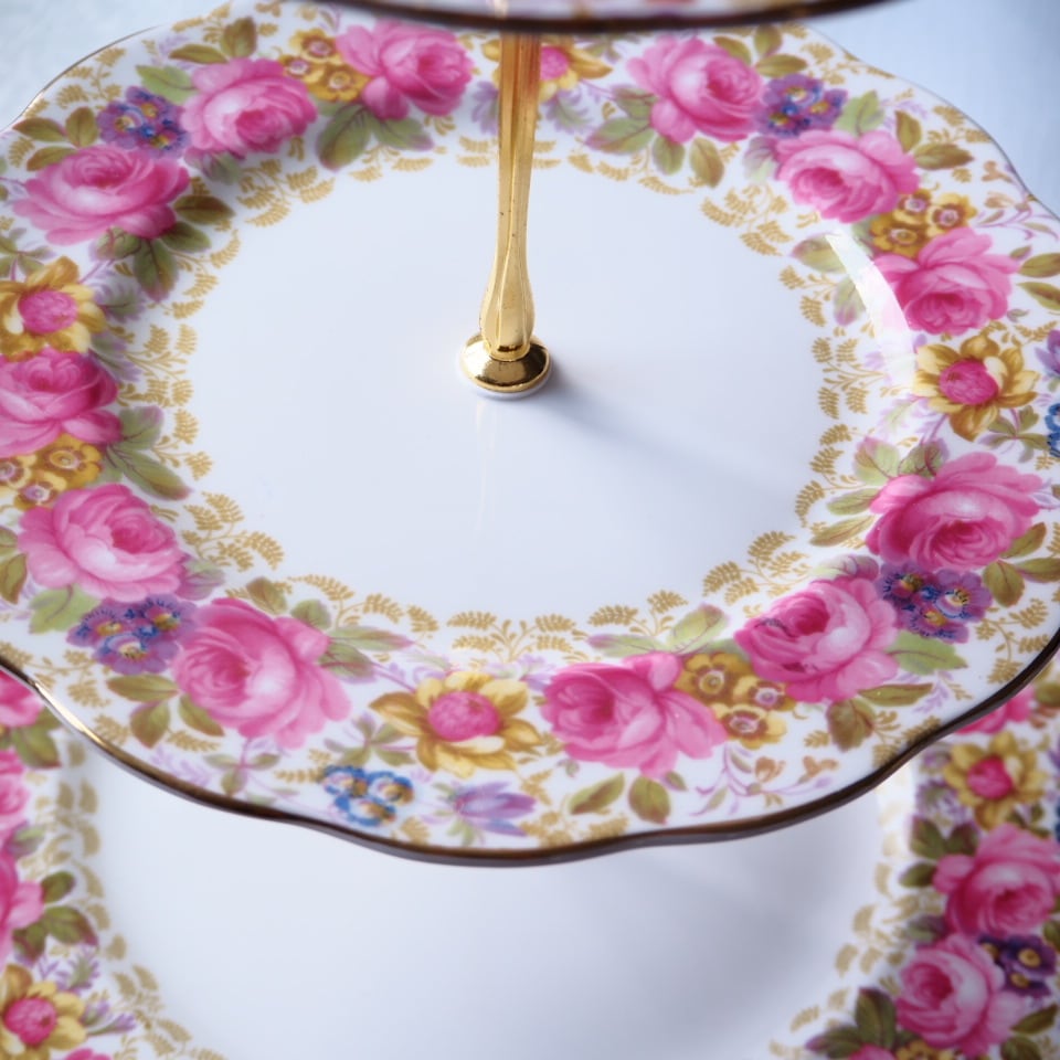 【 タロット16 塔 】英国ロイヤルアルバート セレナ スリーティアーズ スタンド《支柱新品・ローズガーランドが愛らしい英国製》 F4