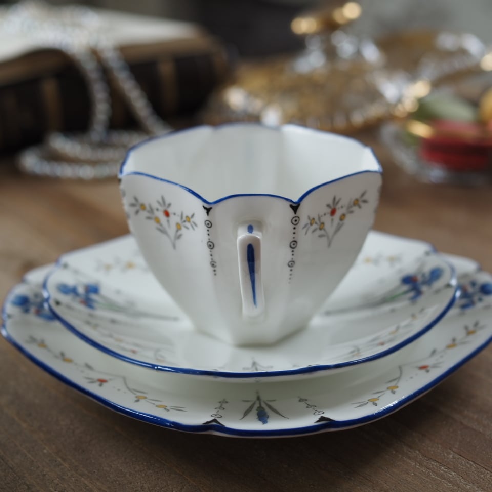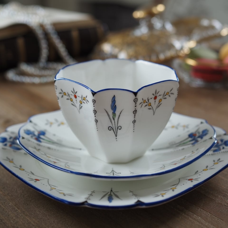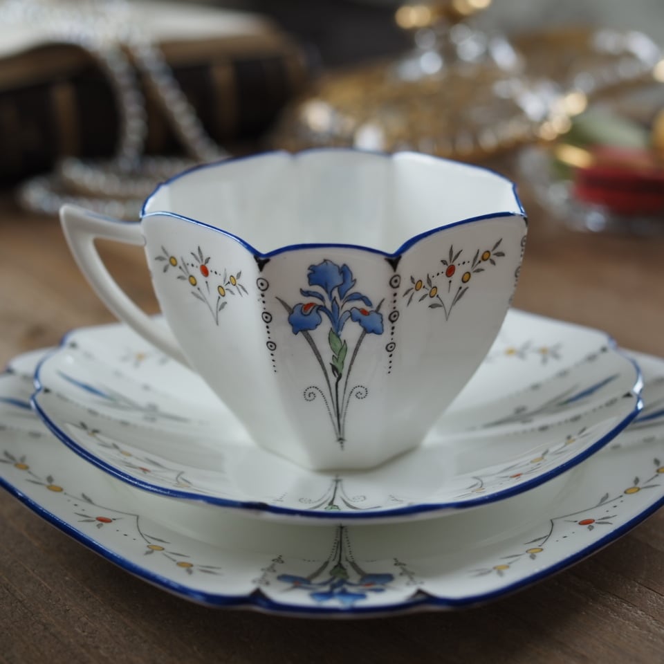 【 タロット18 月 】英国シェリーShelley クイーンアン アイリス トリオ カップ&ソーサー F8