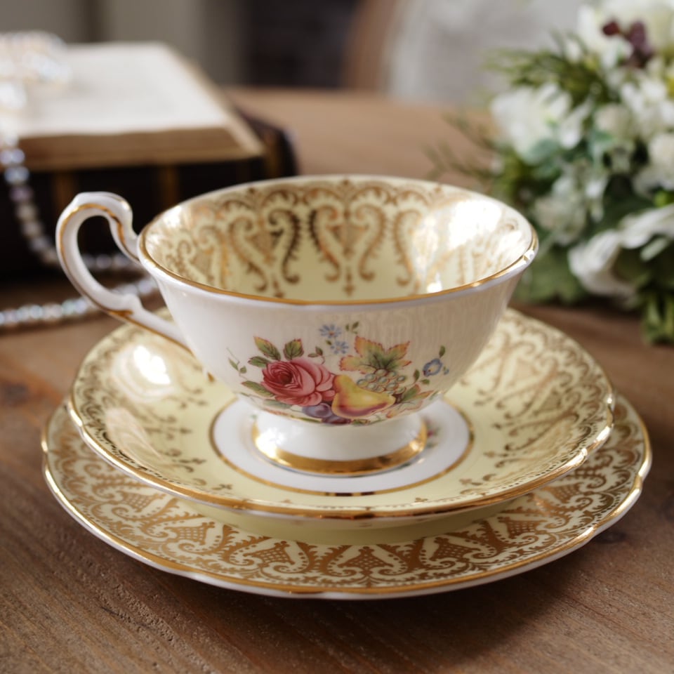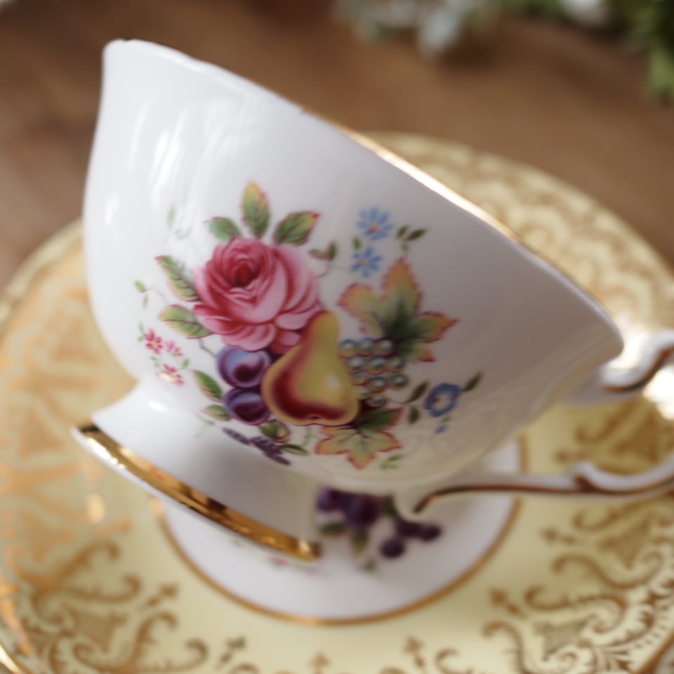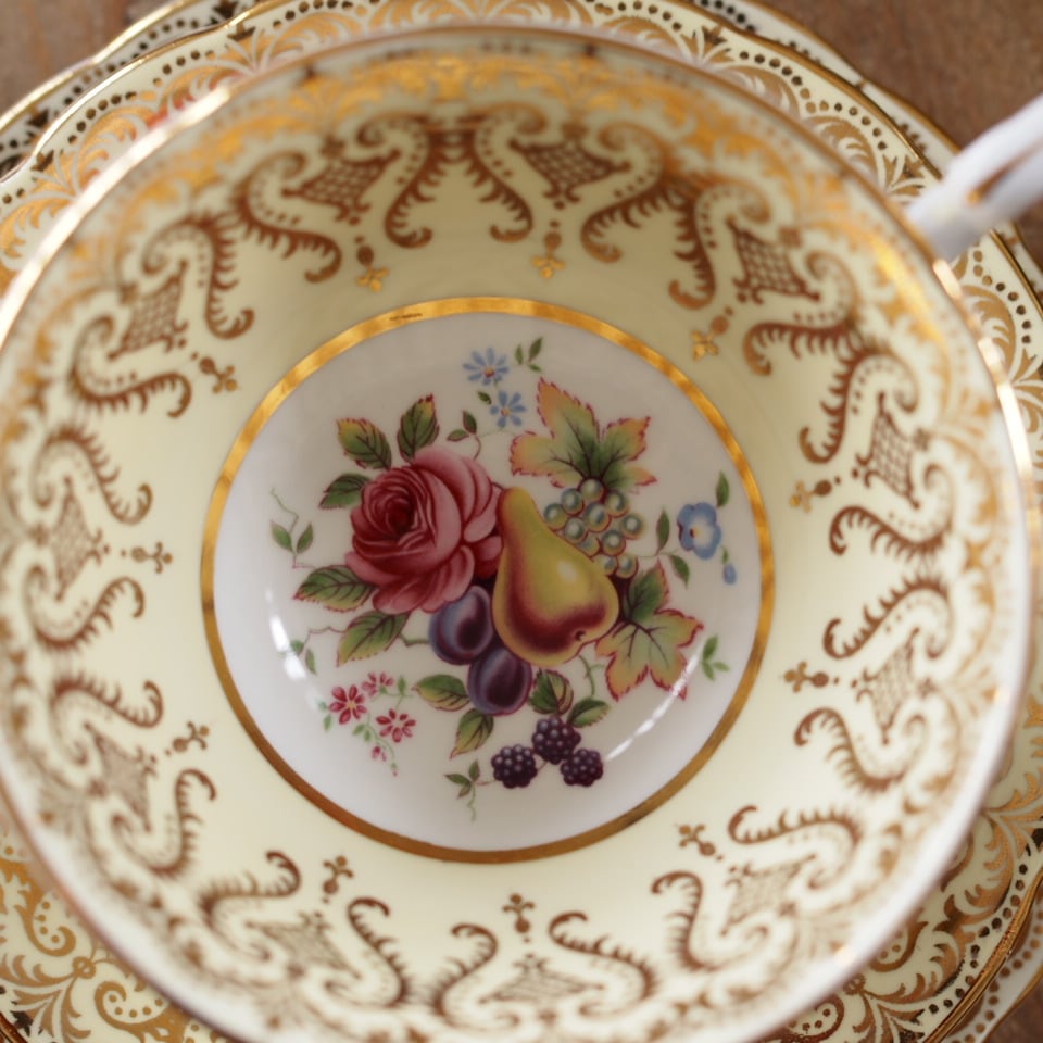 【 タロット19 太陽 】英国パラゴン 金彩果実文 フルーツ絵柄トリオ イエロー カップ&ソーサー F7