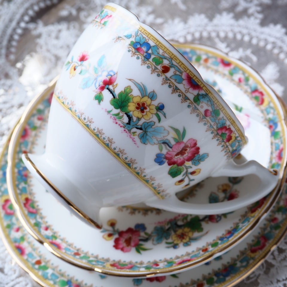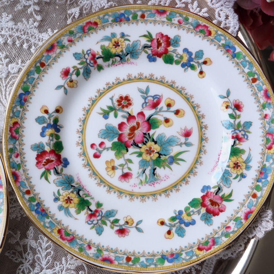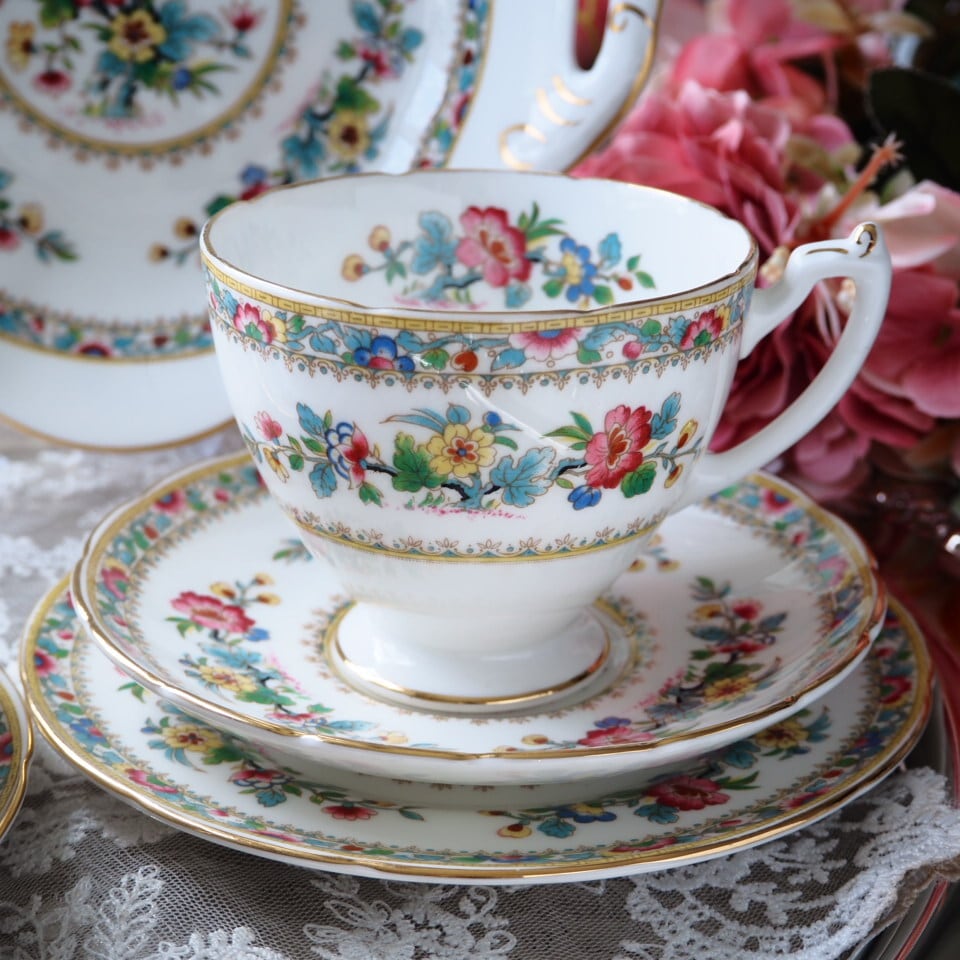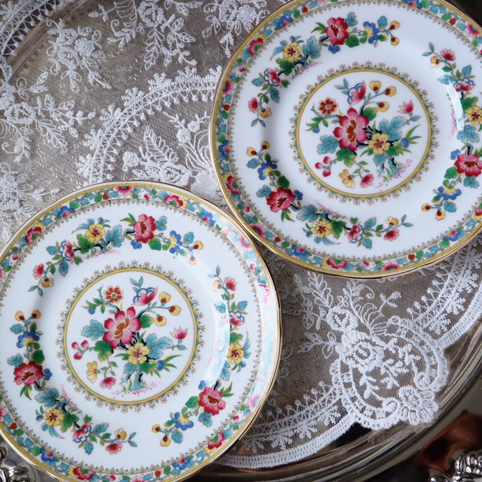 英国の名窯コールポートより、優美な花々が咲き誇る「ミングローズ」シリーズのトリオ2客と、少し深さのある珍しい大皿プレートをセットでご紹介いたします。