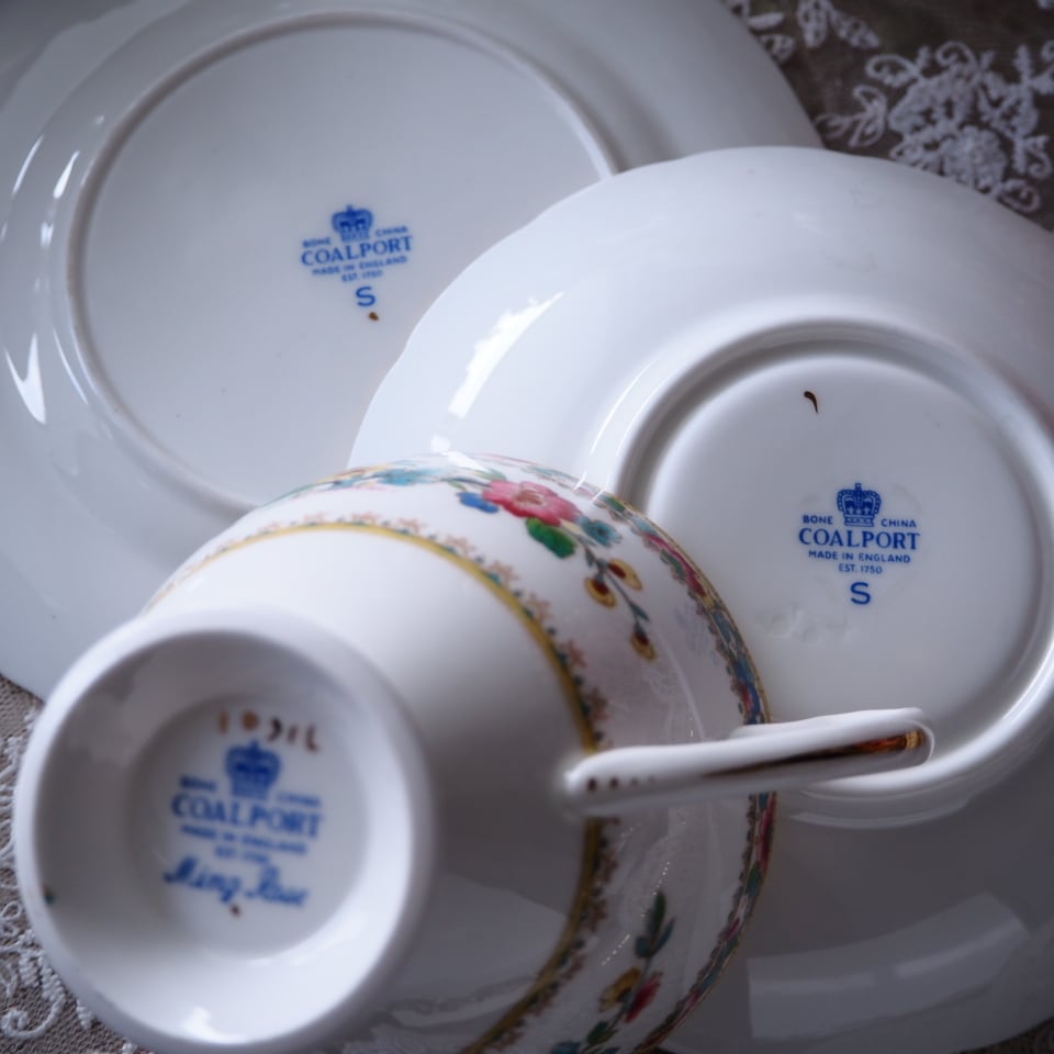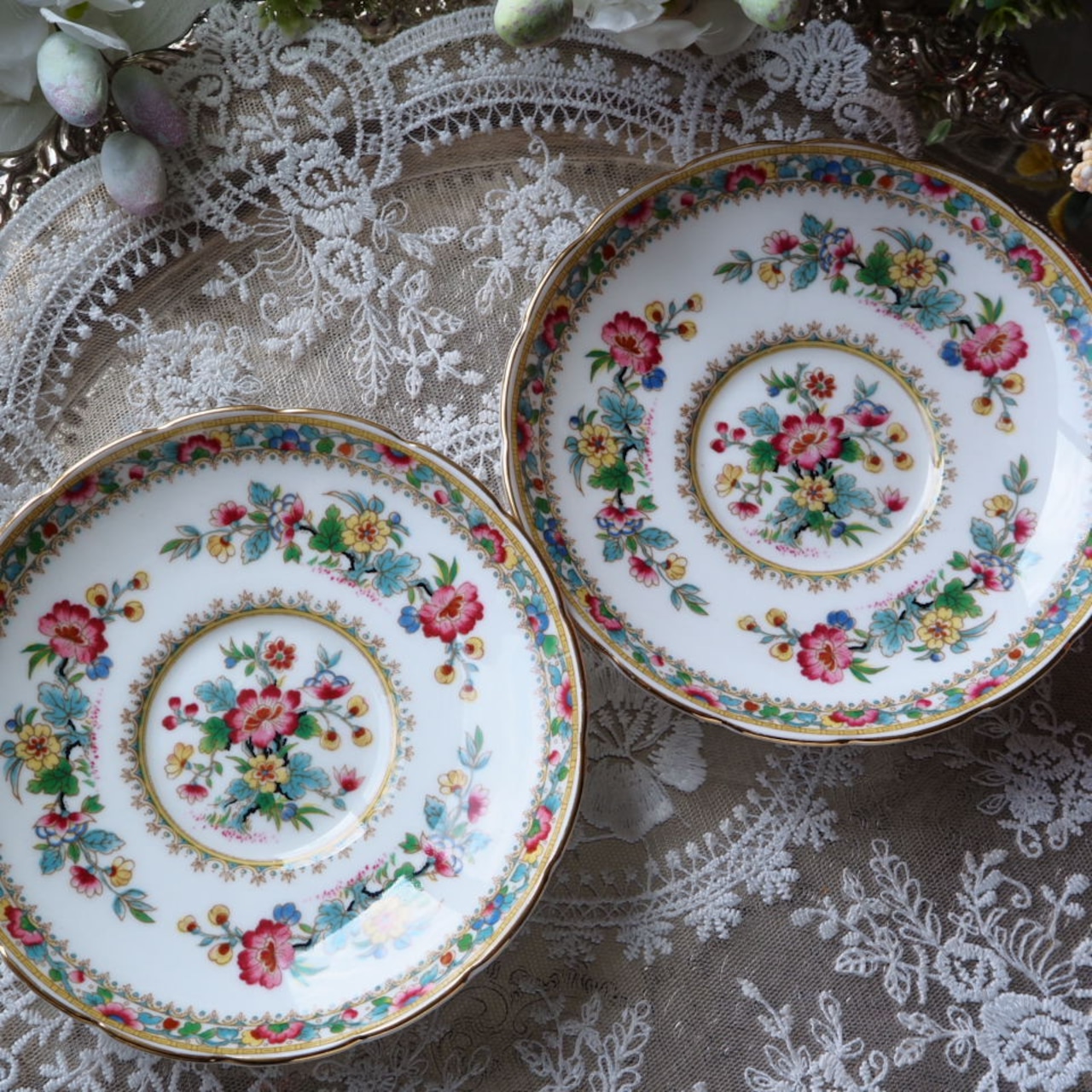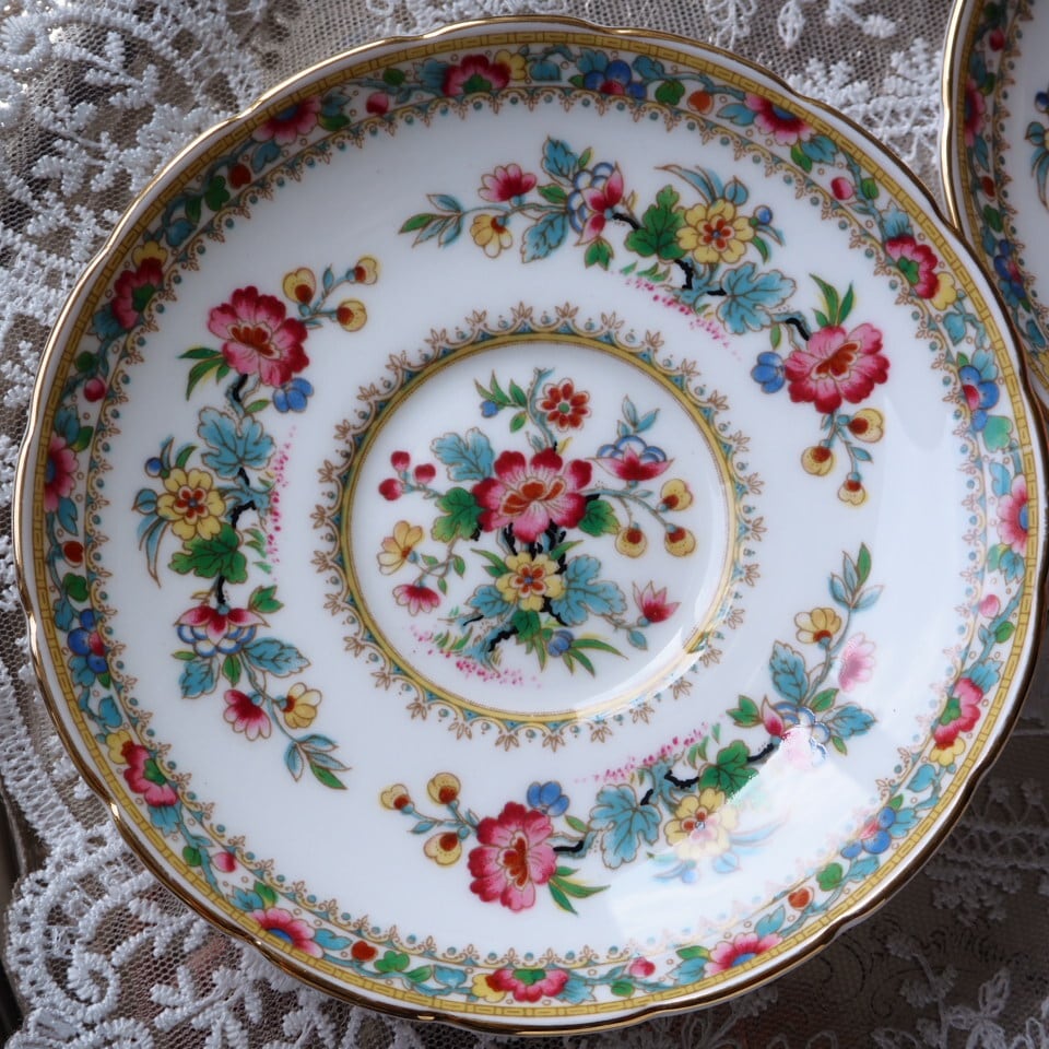 英国の名窯コールポートより、優美な花々が咲き誇る「ミングローズ」シリーズのトリオ2客と、少し深さのある珍しい大皿プレートをセットでご紹介いたします。