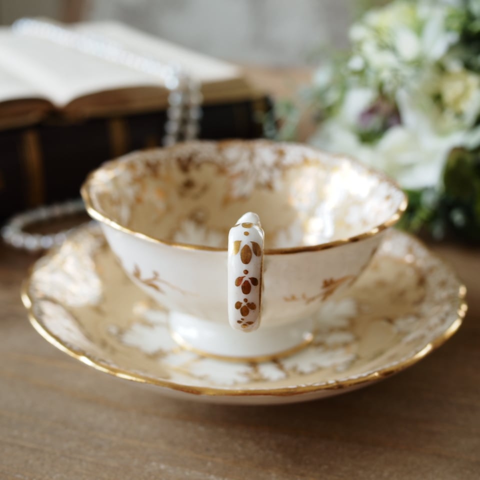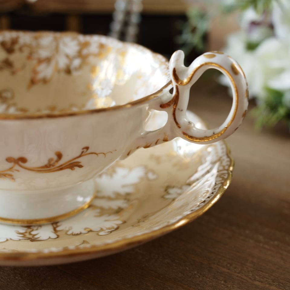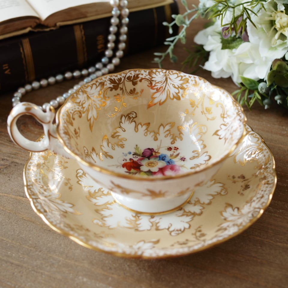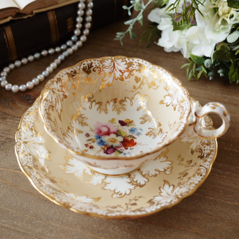 19世紀半ば、ヴィクトリア朝時代のイギリスで作られた、息を呑むほどに美しいカップ&ソーサーです。当時の貴族たちが愛した、贅沢な金彩と繊細なハンドペイントが施された逸品です。