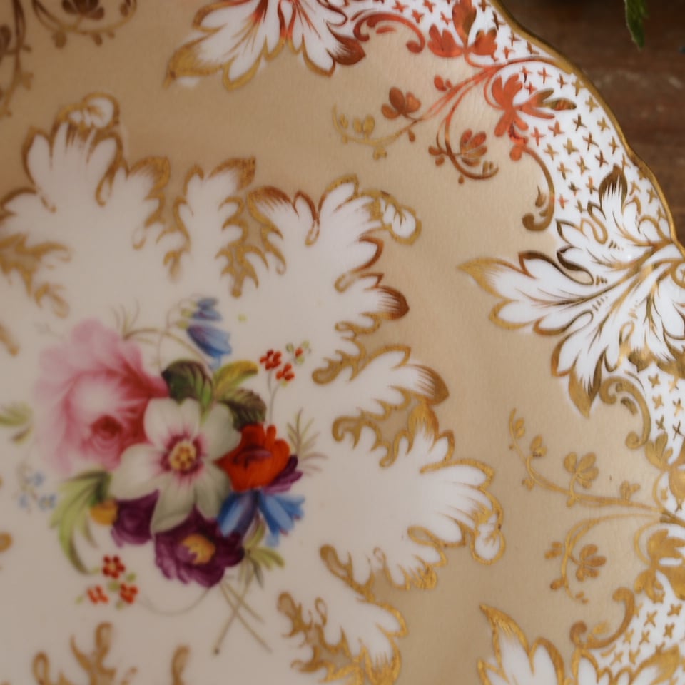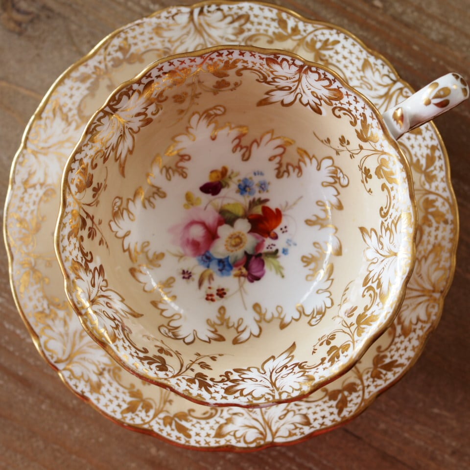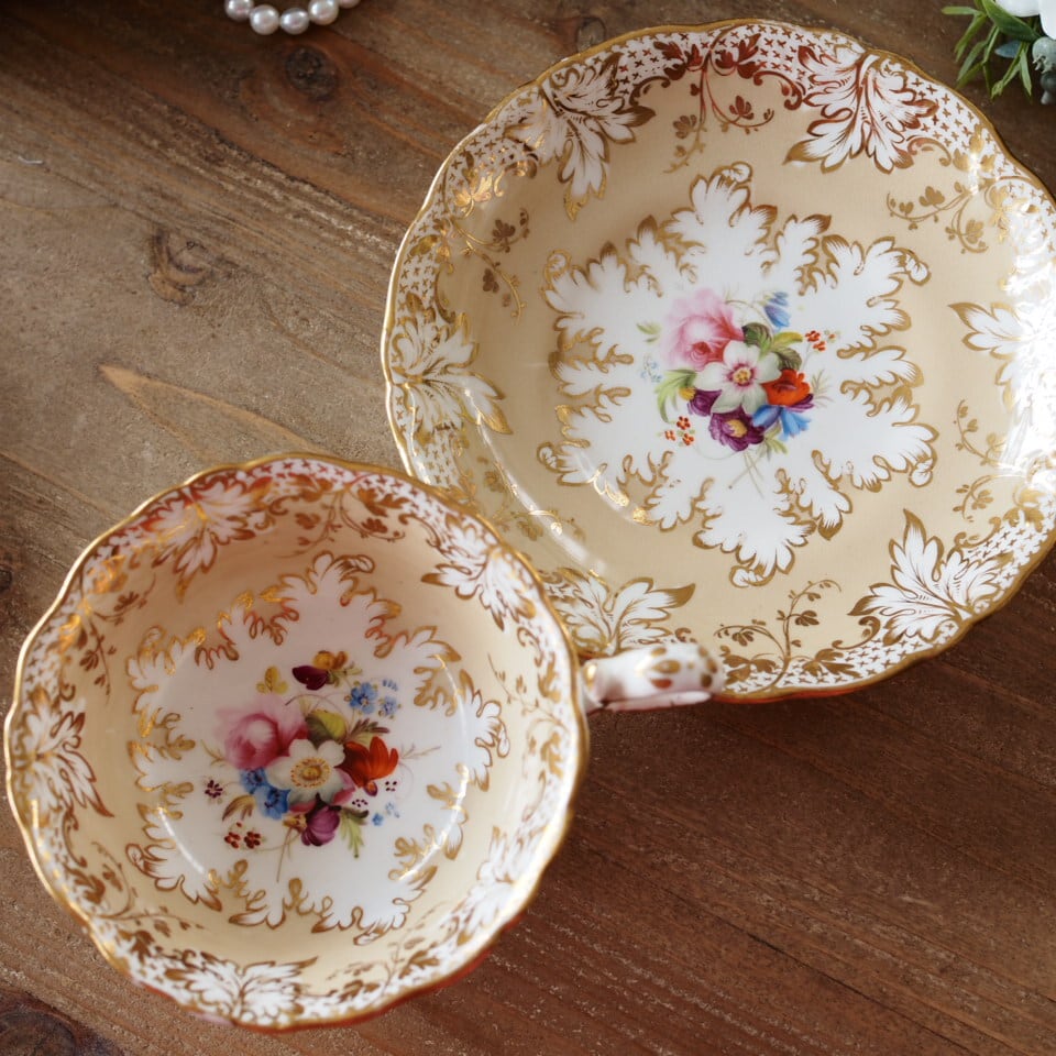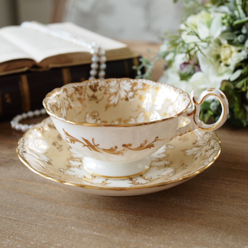 19世紀半ば、ヴィクトリア朝時代のイギリスで作られた、息を呑むほどに美しいカップ&ソーサーです。当時の貴族たちが愛した、贅沢な金彩と繊細なハンドペイントが施された逸品です。