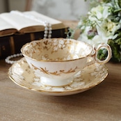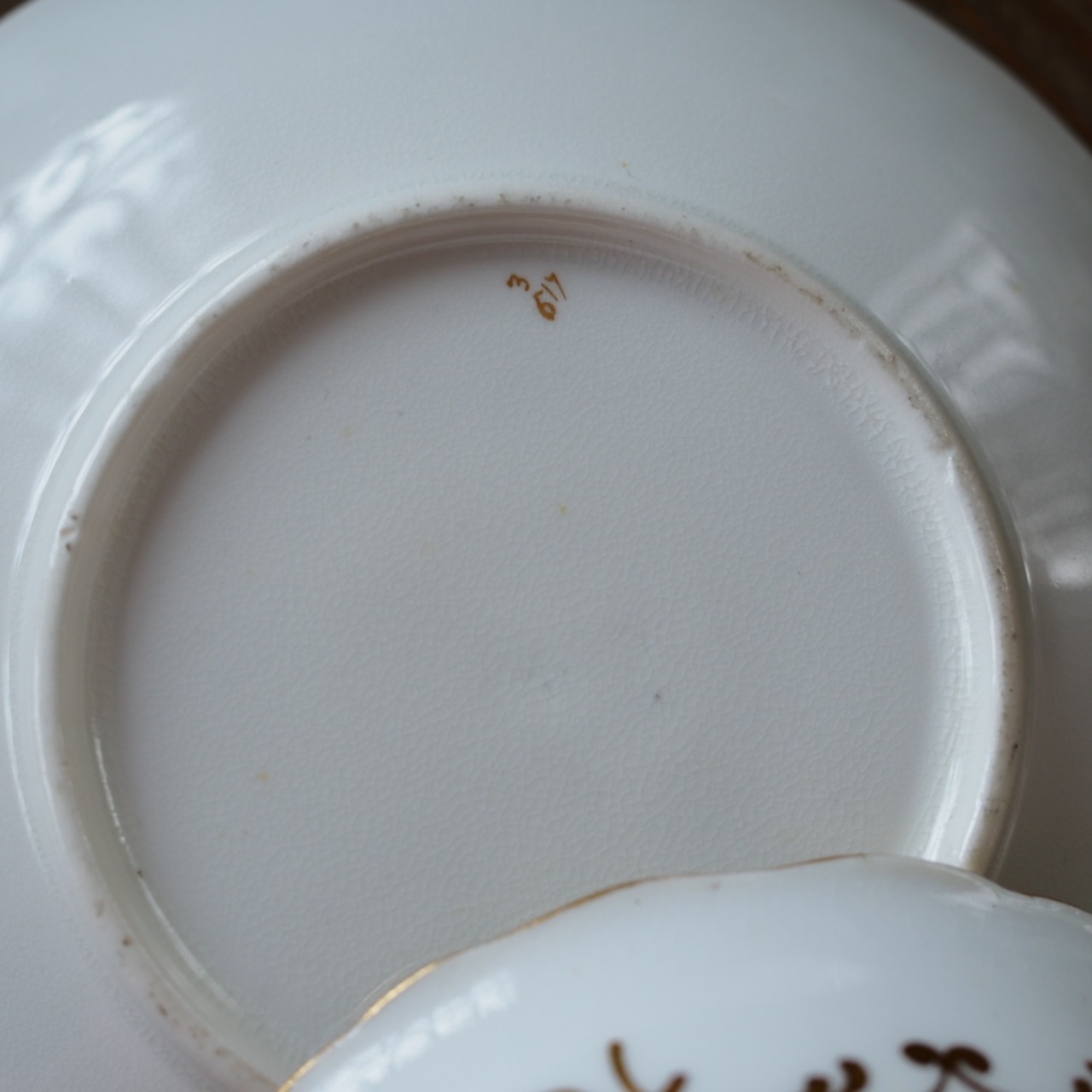 カップの内側とソーサーを縁取るのは、力強くも繊細なアカンサス葉のスクロール金彩。経年による深い輝きが、アンティークならではの風格を漂わせます。