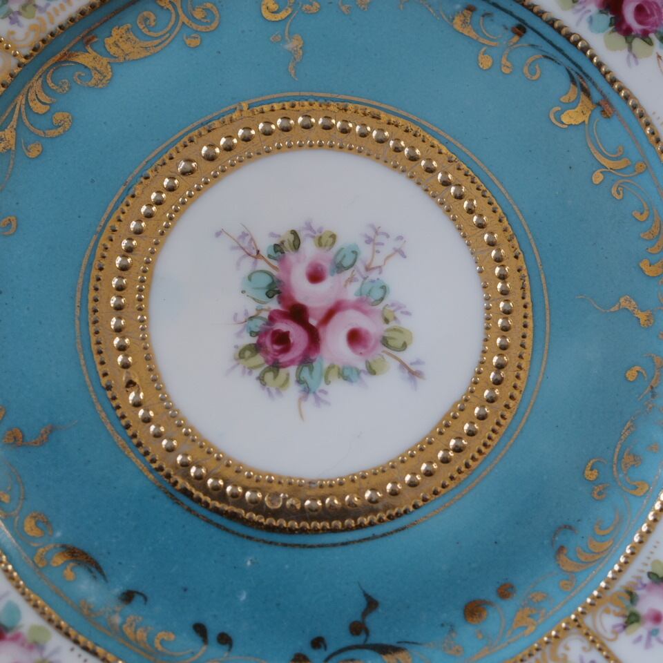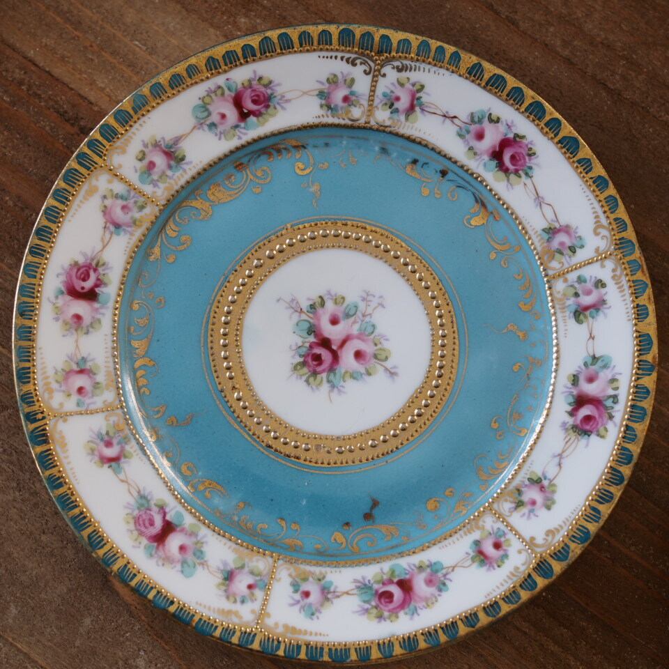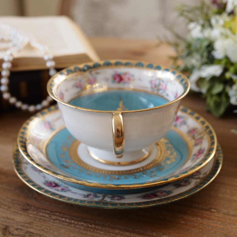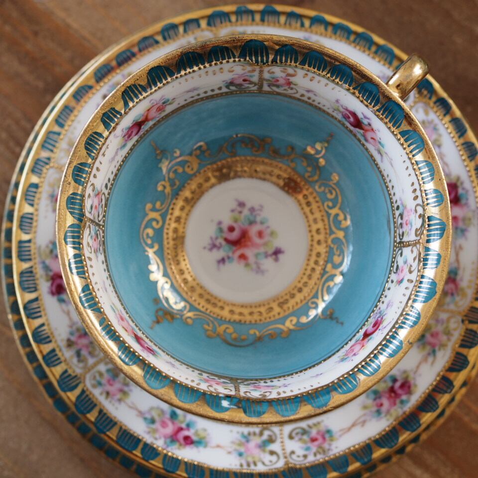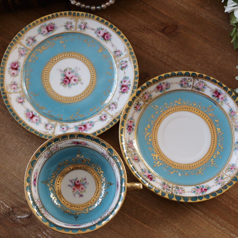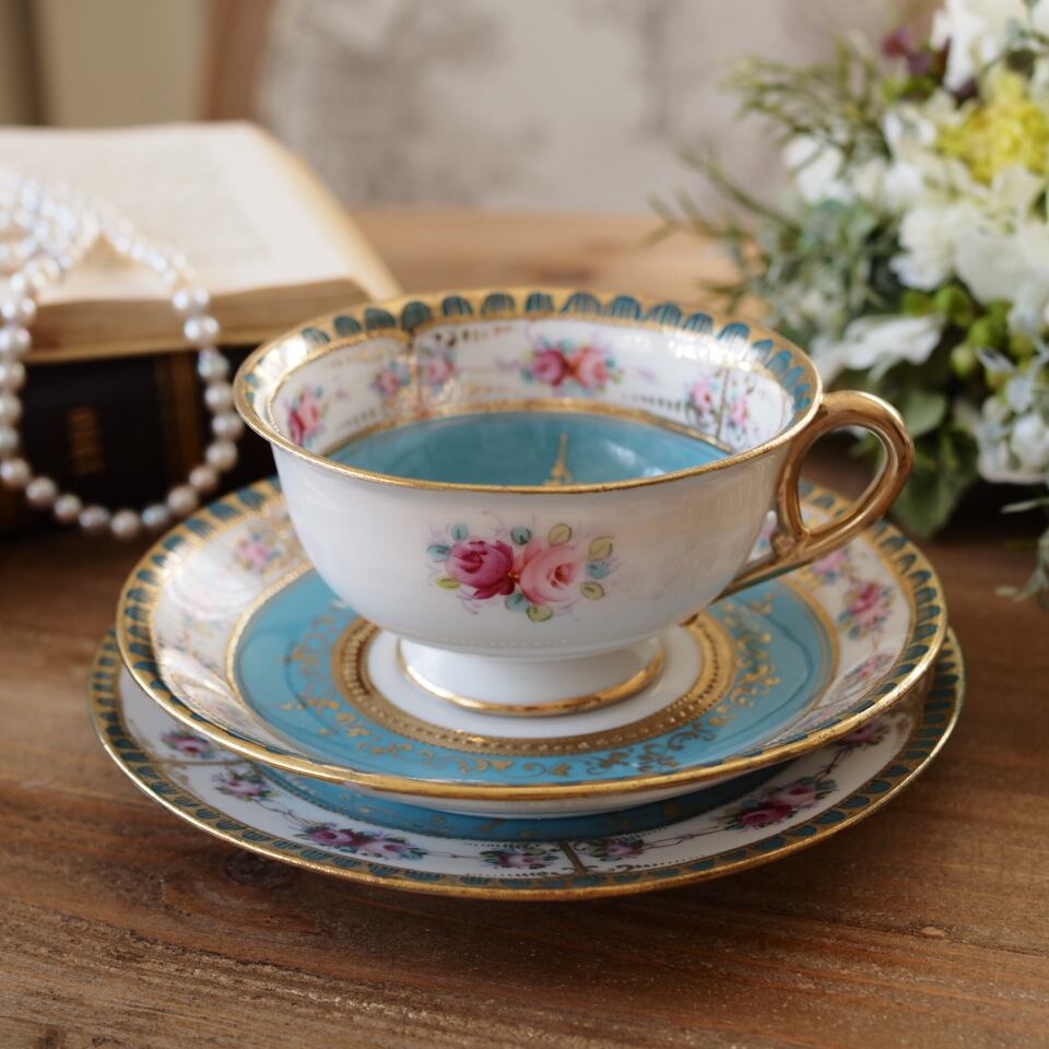 限定1客 オールドノリタケM印 ターコイズ金彩ローズ装飾 トリオ ティーカップ&ソーサー F7