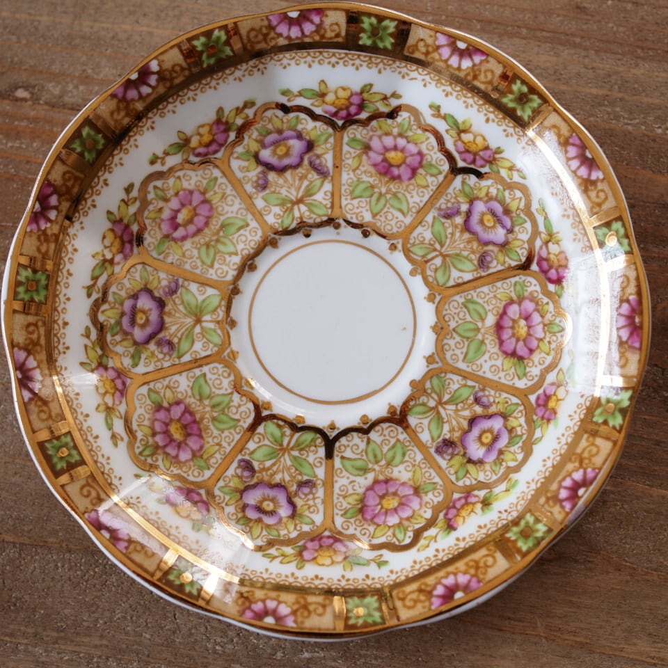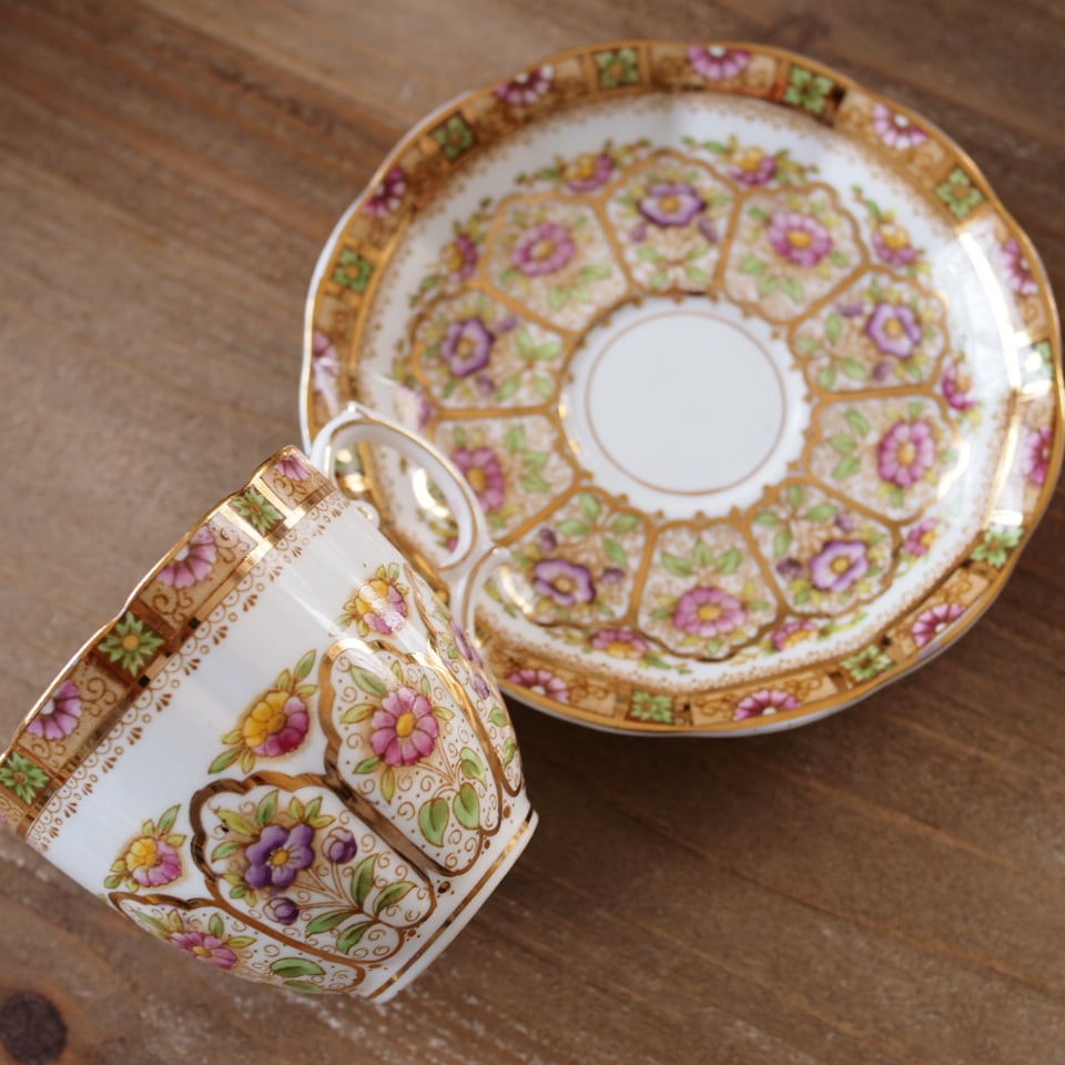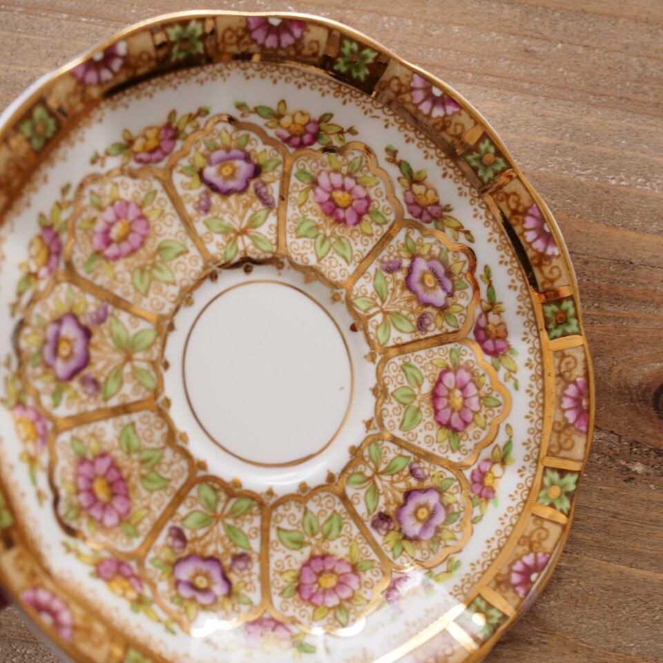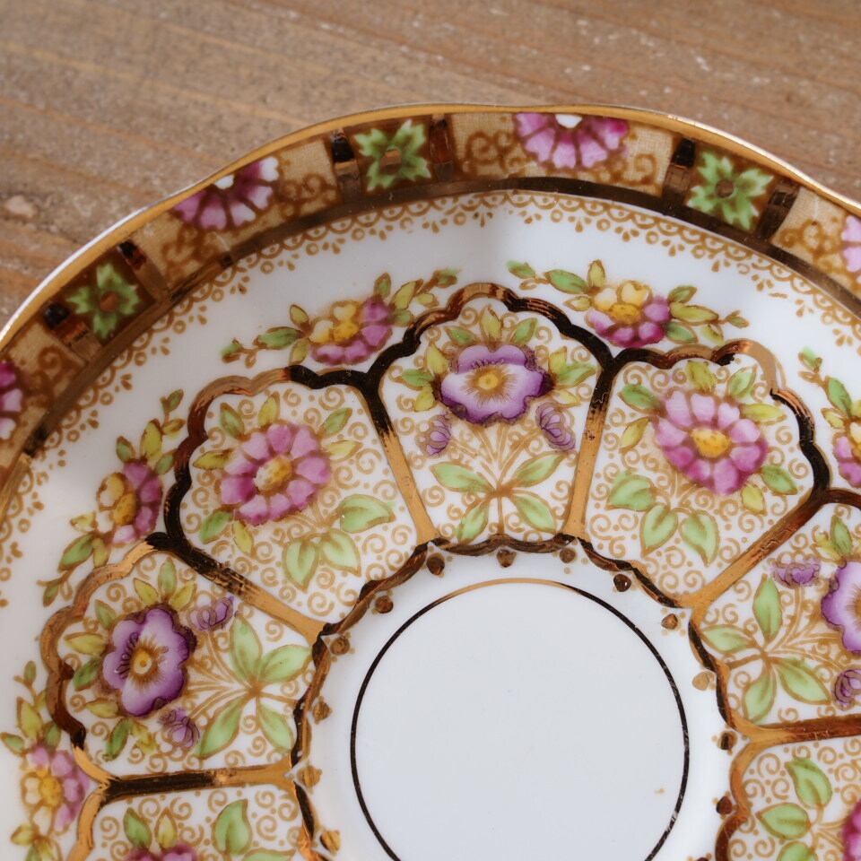 ソーサー全面に広がる花装飾と、優雅なハンドルの曲線が美しく、