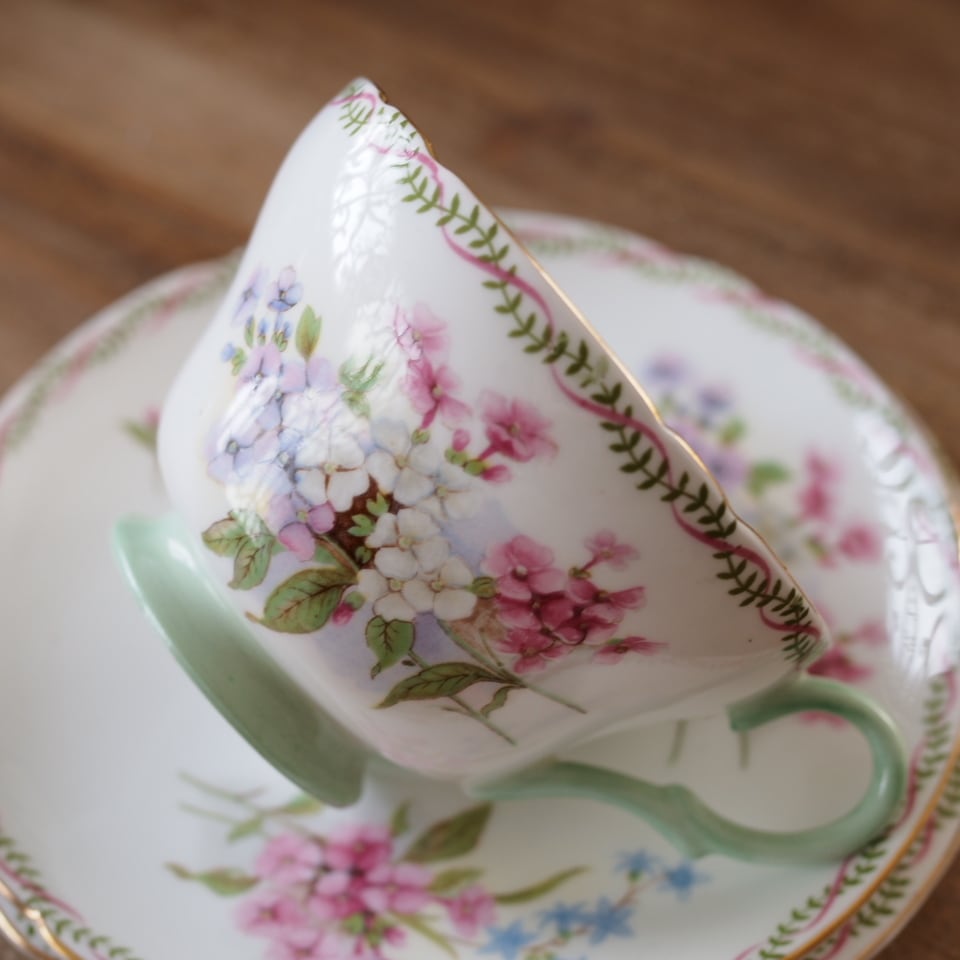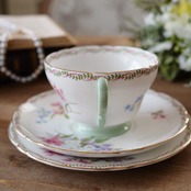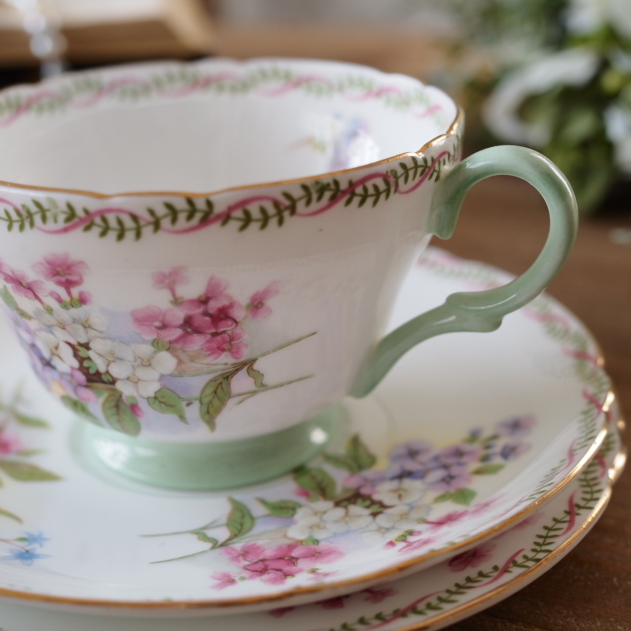 シェリーのトリオは、英国の伝統を感じさせる優雅なフォルムと、シンプルでありながら華やかな花模様が魅力です。多くの人に愛され続けるシェリーの逸品で、普段使いから特別なおもてなしまで多用途にお使いいただけます。