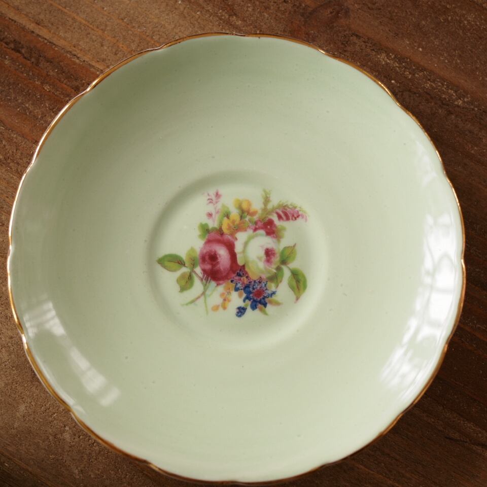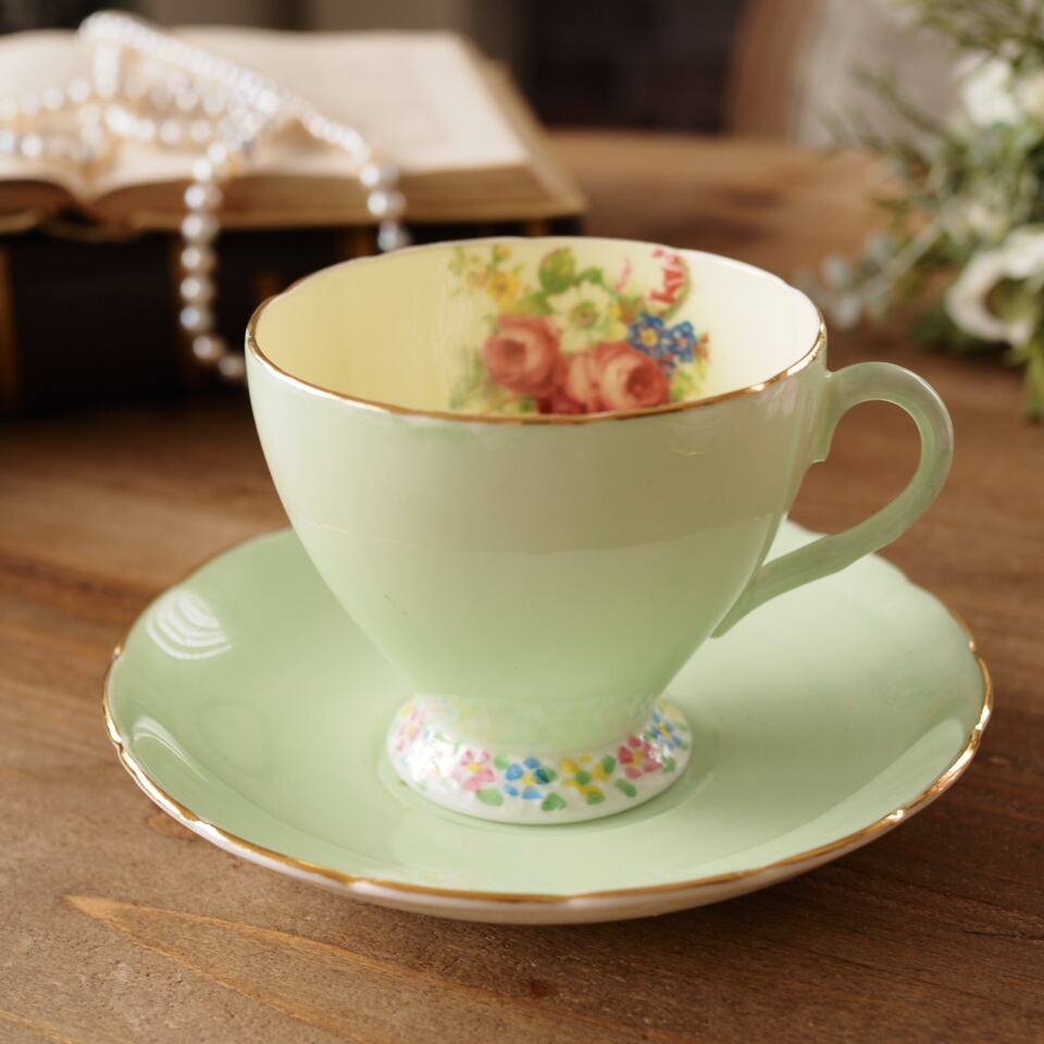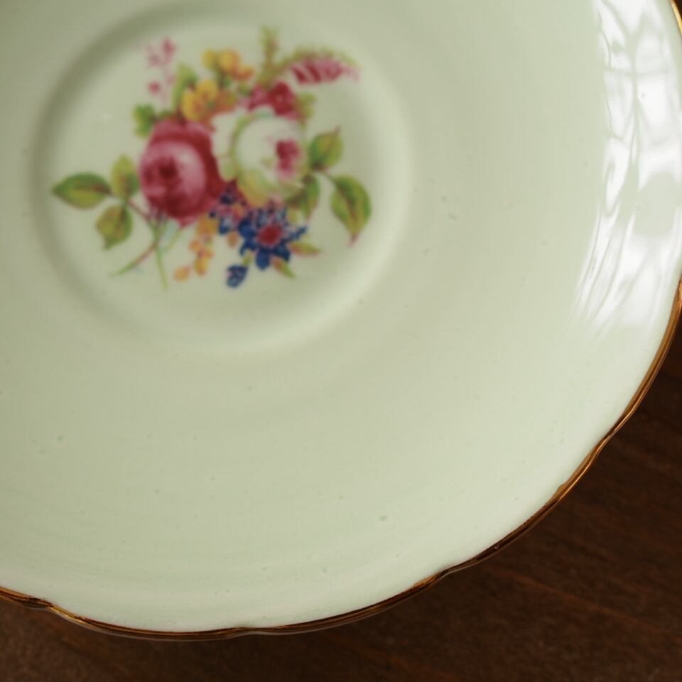 やわらかなミントグリーンの釉薬に、カップ内側とソーサー中央に描かれた可憐なフラワーブーケ。