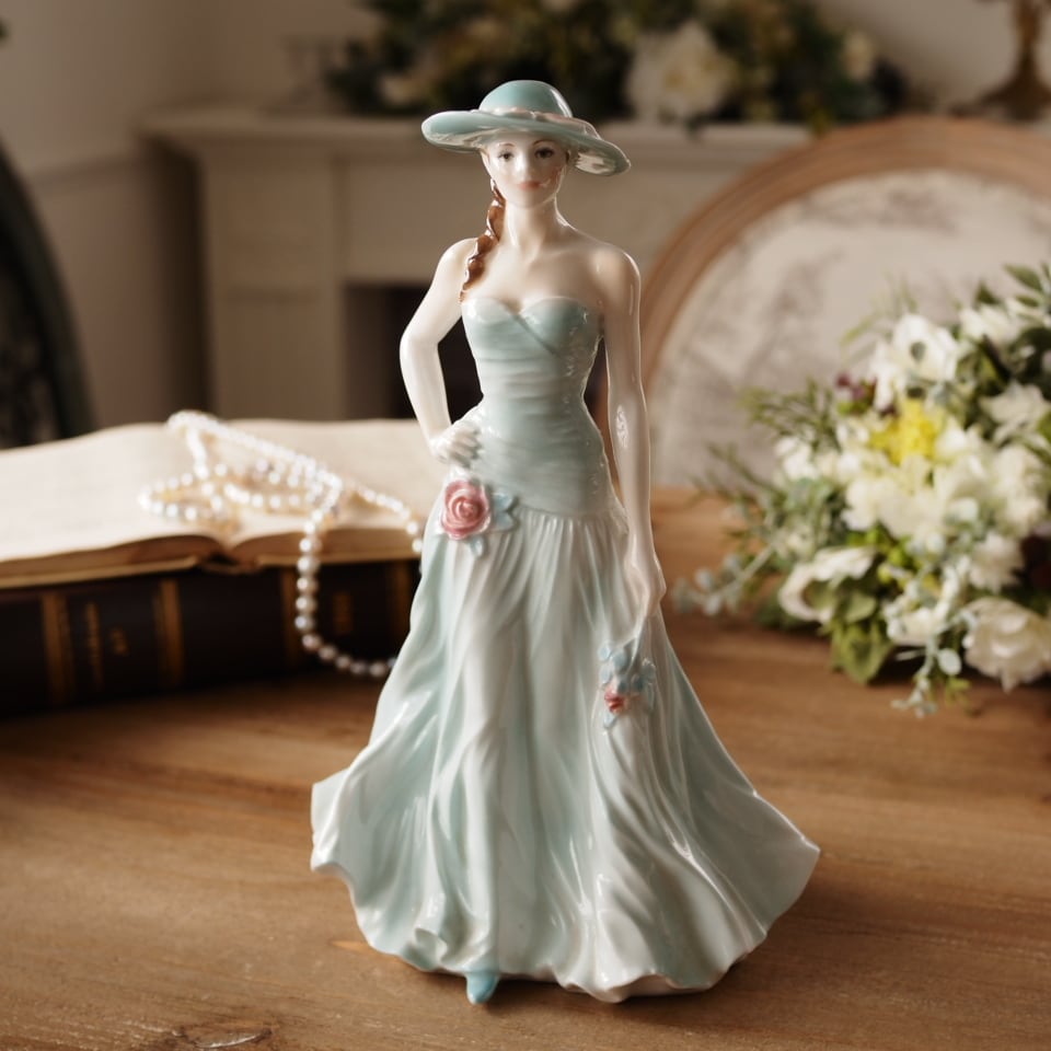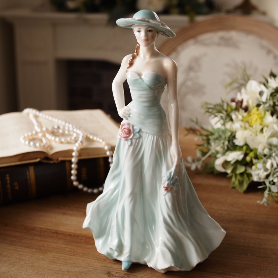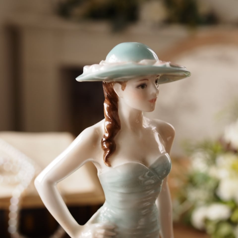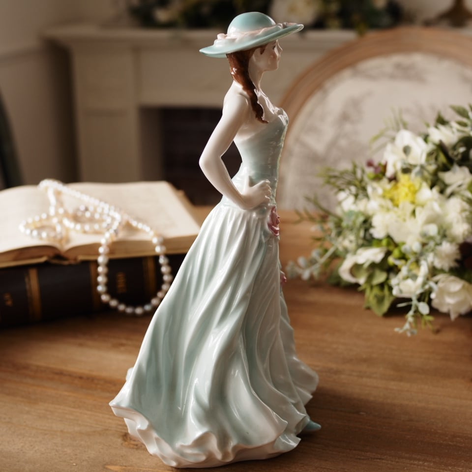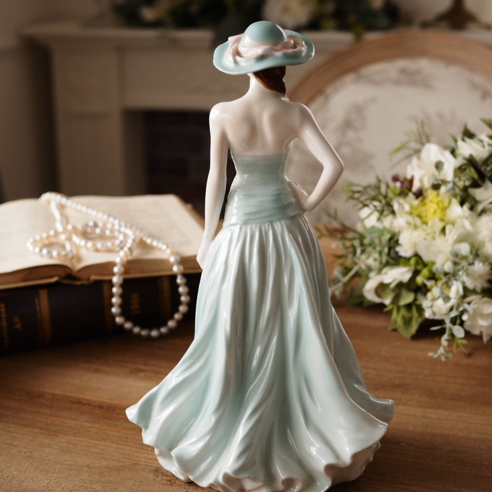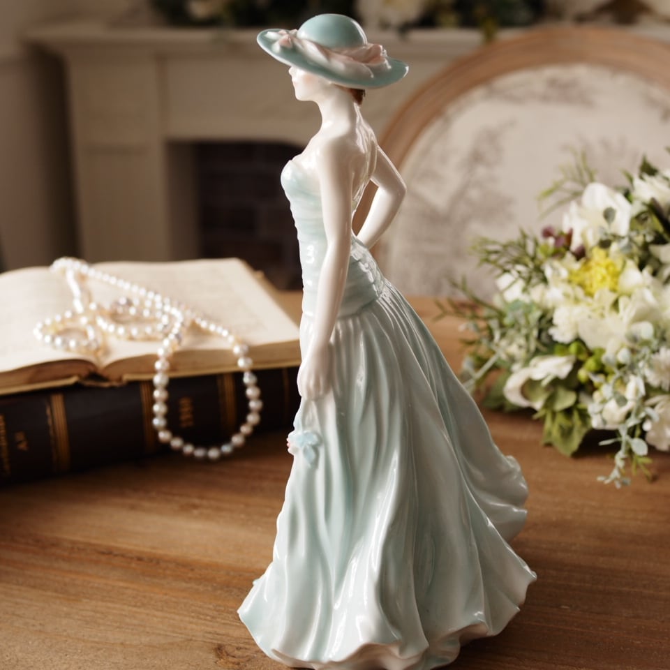 淡いミントグリーンのドレスと帽子が印象的な優雅な女性像で、身体に沿うドレスの造形や流れるようなスカートのドレープ表現がとても美しい作品です。腰元の薔薇装飾や帽子のリボンなど細部まで丁寧に作り込まれており、ロイヤルウースターらしい上品さを感じられます。