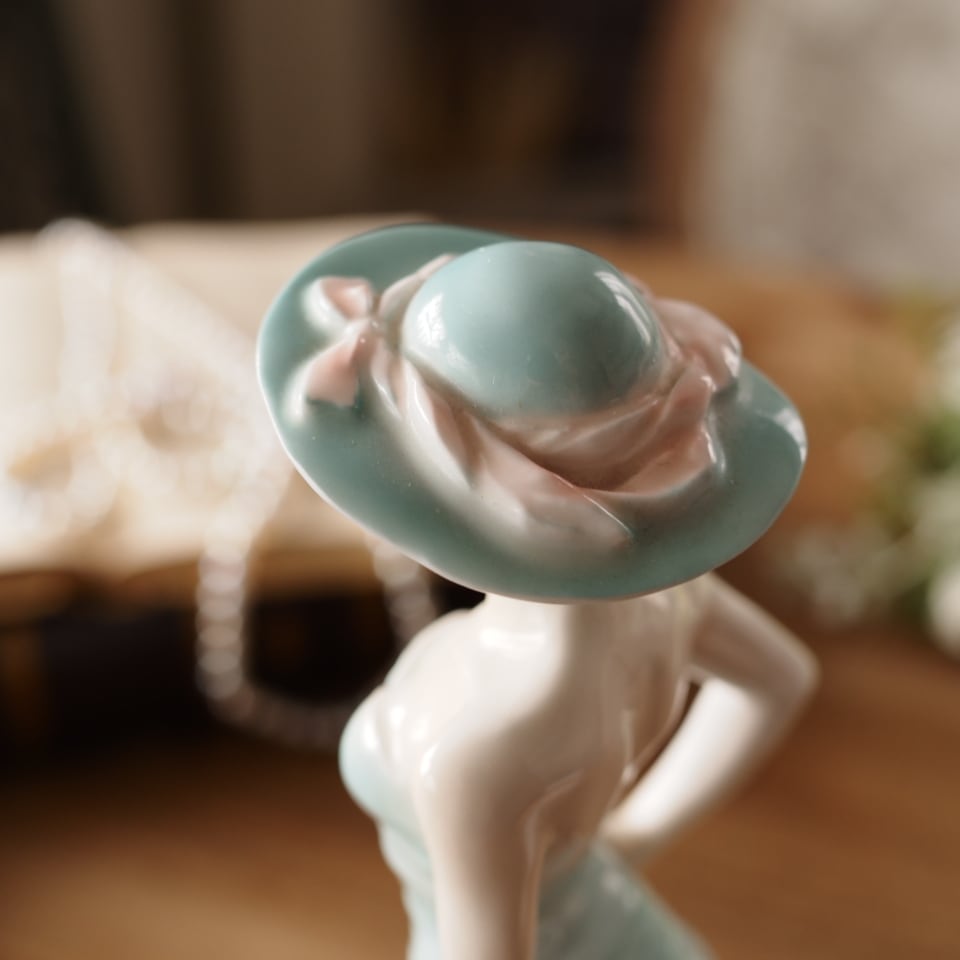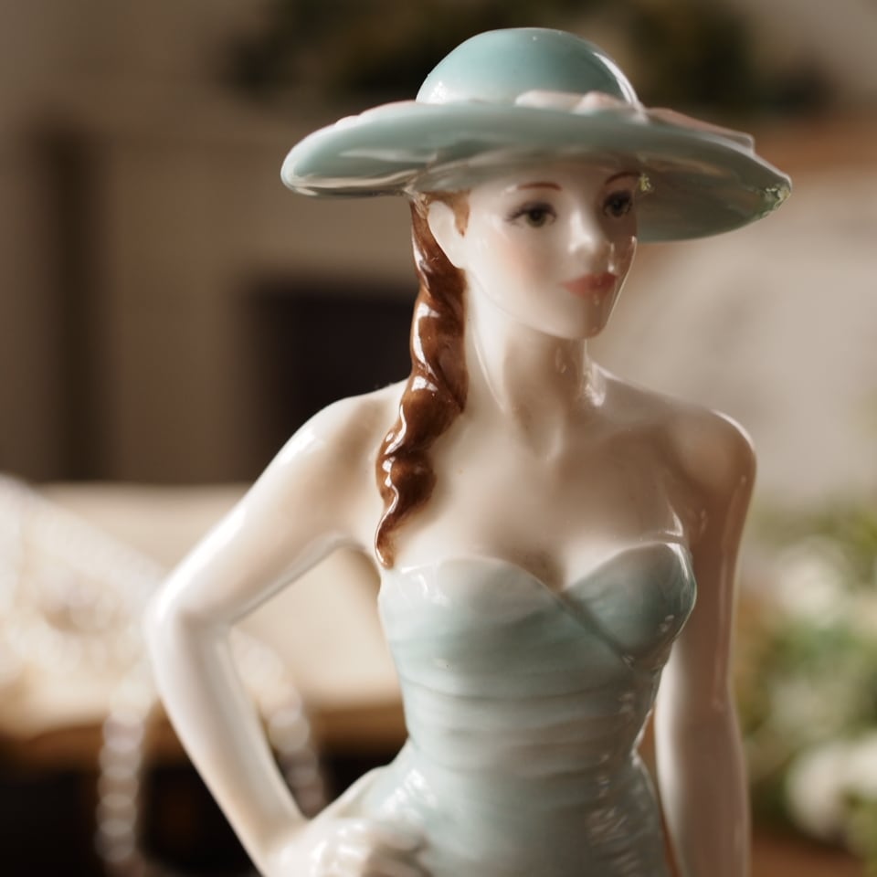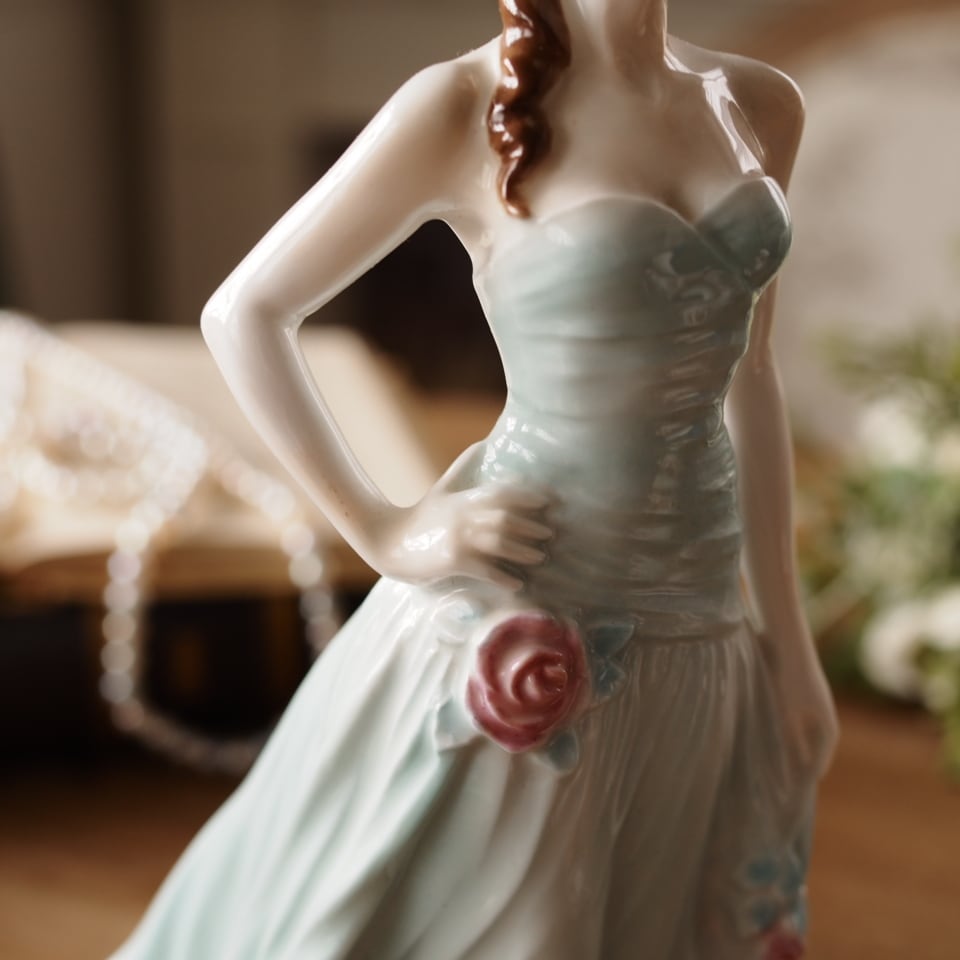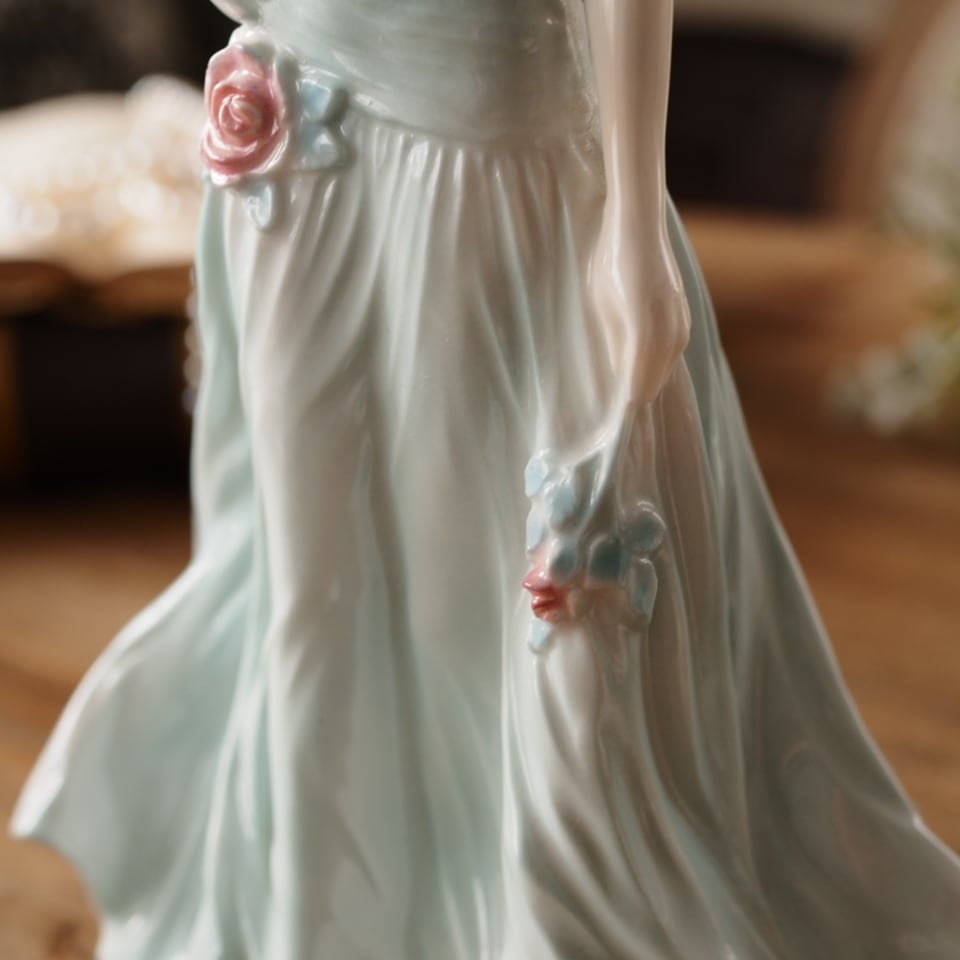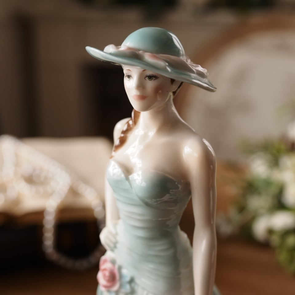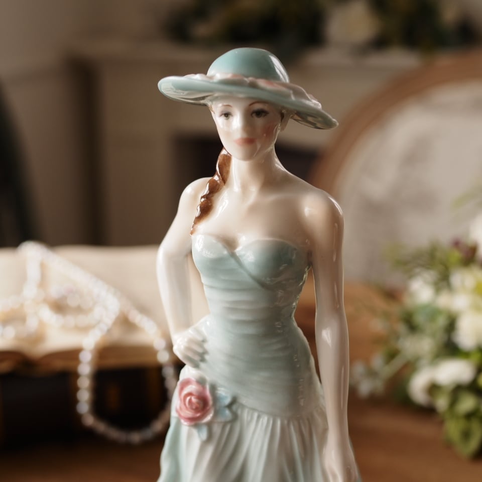 淡いミントグリーンのドレスと帽子が印象的な優雅な女性像で、身体に沿うドレスの造形や流れるようなスカートのドレープ表現がとても美しい作品です。腰元の薔薇装飾や帽子のリボンなど細部まで丁寧に作り込まれており、ロイヤルウースターらしい上品さを感じられます。