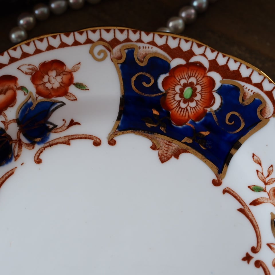 1900年代初頭のタスカン窯が放つ、この鮮烈なイマリ様式は、ブランドのイメージを覆すほど力強く希少な一客です。伝統を破壊し、新たな時代を先取りしたかのような多角的なシェイプは、まさに劇的な変化を告げる【死神】の象徴。現代まで遺されたこの重厚な美しさは、当時の高級ラインのみが持つ特別な格を宿しています。