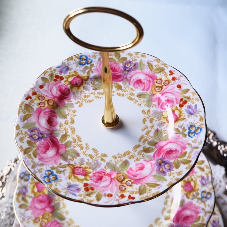 ロイヤルアルバートの人気シリーズ「セレナ」の華やかなスリーティアーズスタンドです。優美なローズガーランドに、淡いブルーやパープルの小花が彩りを添え、まるでイングリッシュガーデンのような華やかさを感じさせてくれます。