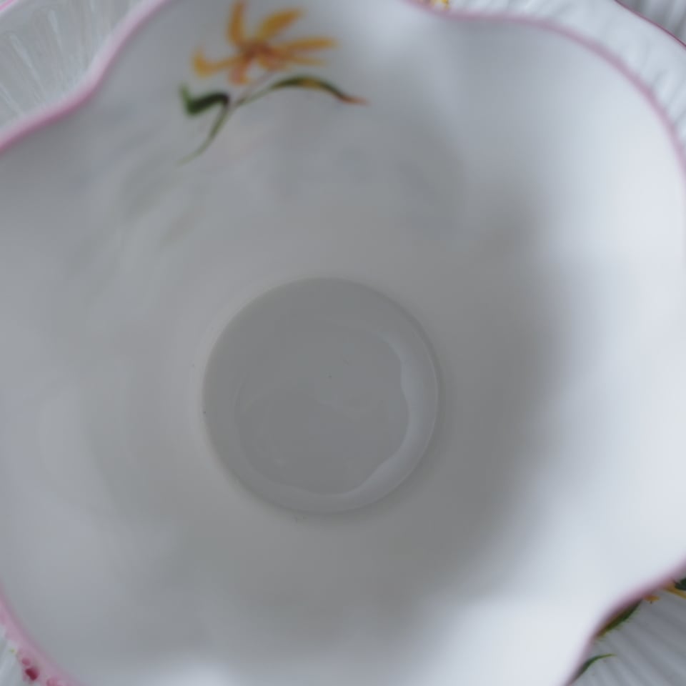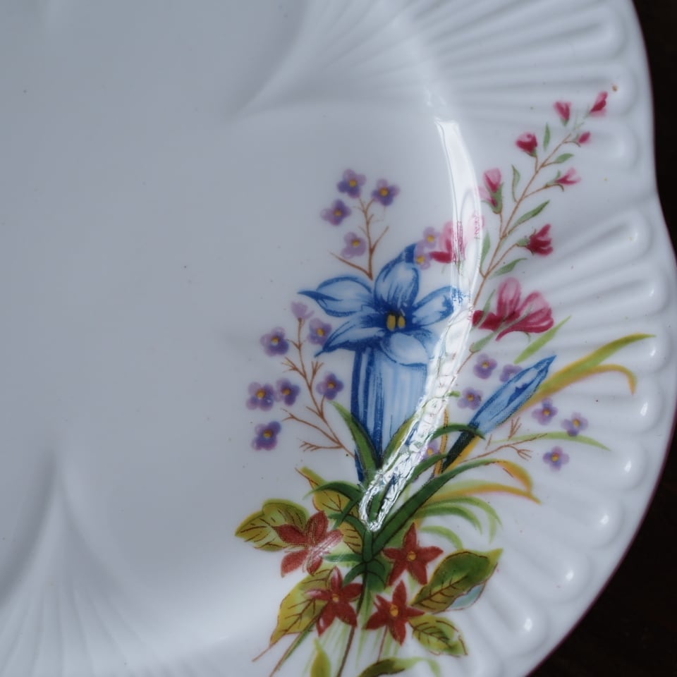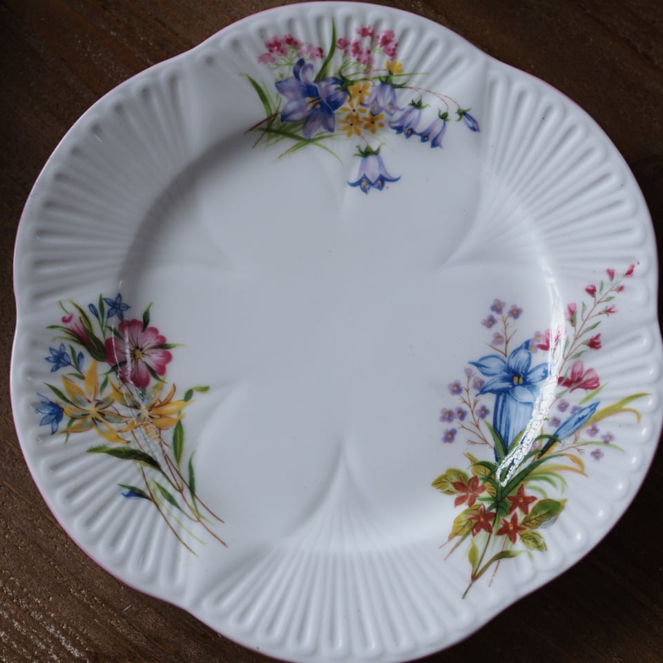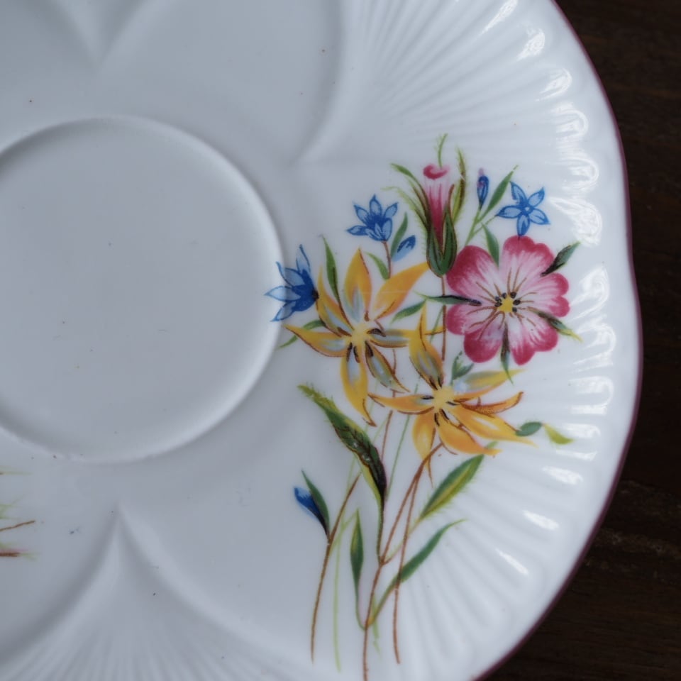 英国シェリーらしい軽やかなシェイプに、野に咲く花々を束ねたような優しい絵付けが広がる一客です。
