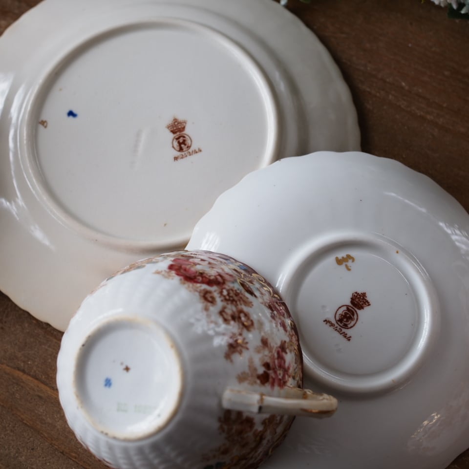 王冠マークと登録意匠番号が刻まれたバックスタンプを持つ作品で、細やかな花模様に金彩が施された上品な一客です。赤を基調に青や緑の差し色が添えられ、落ち着きのある色調の中に奥行きが感じられます。