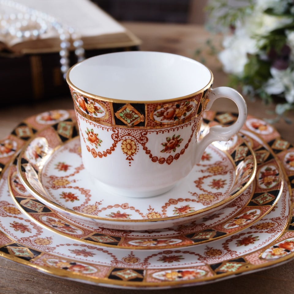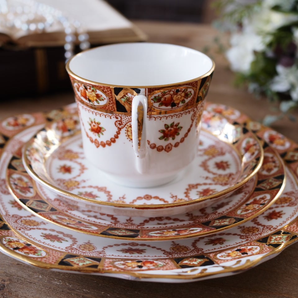 イギリスの老舗陶器メーカー、Sutherlandによる美しいエドワーディアン様式のトリオ(カップ、ソーサー、プレート)にケーキプレートを加えた豪華な4点セットです。