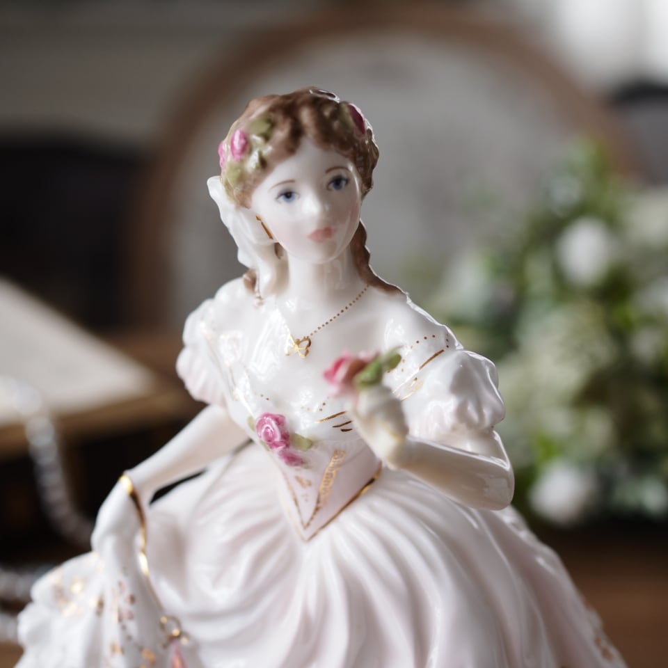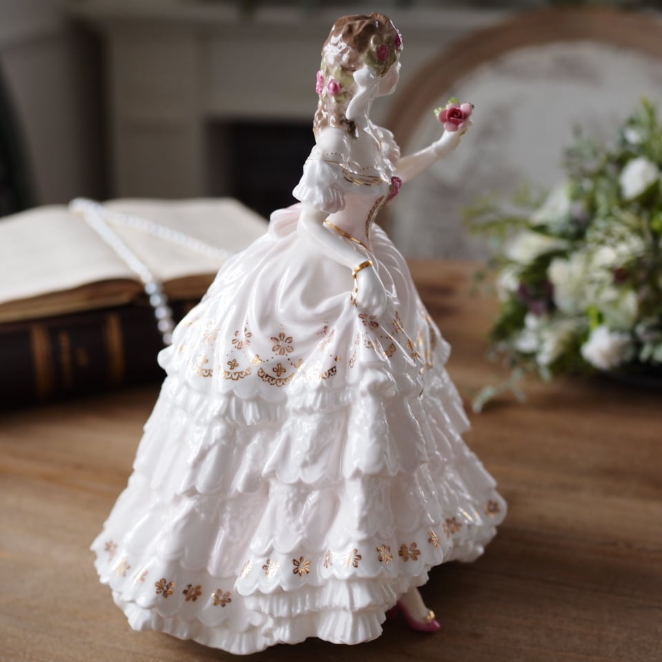胸元の薔薇の装飾やドレスのフリル、金彩による繊細な模様など、細部まで丁寧に表現されており、ロイヤルウースターならではの気品ある仕上がりが魅力です。