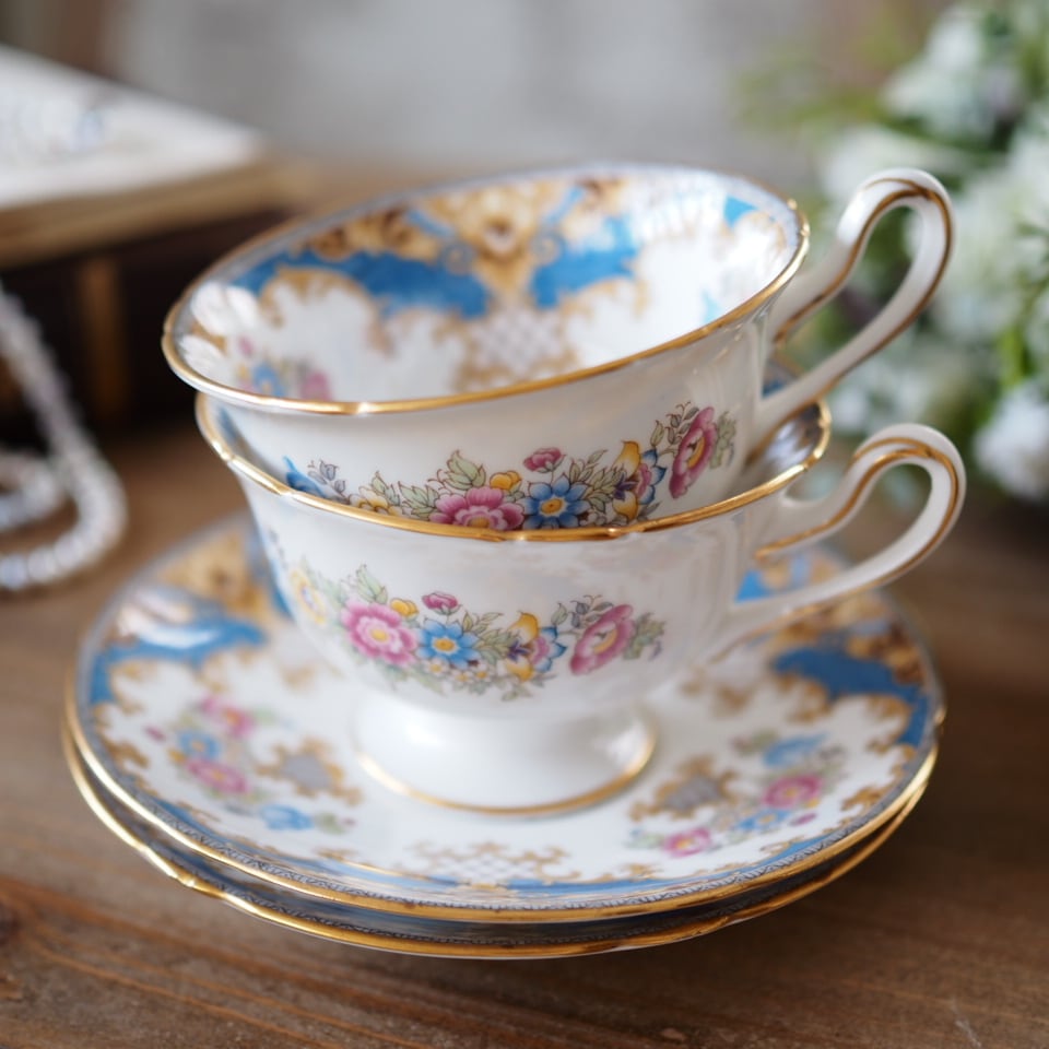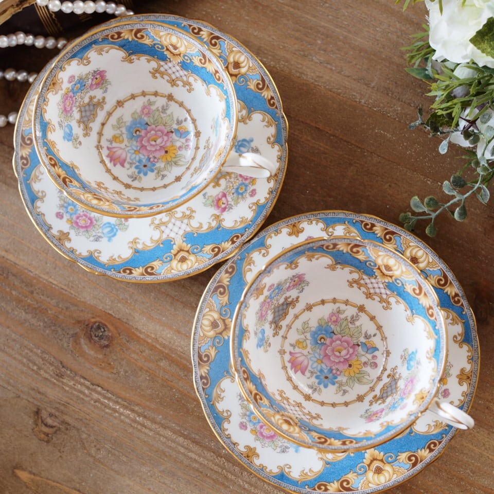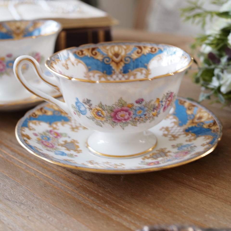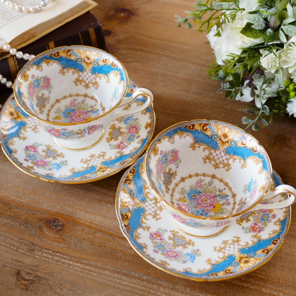 英国シェリー シェラトン 華やかなブルー花束 カップ&ソーサー2客セット