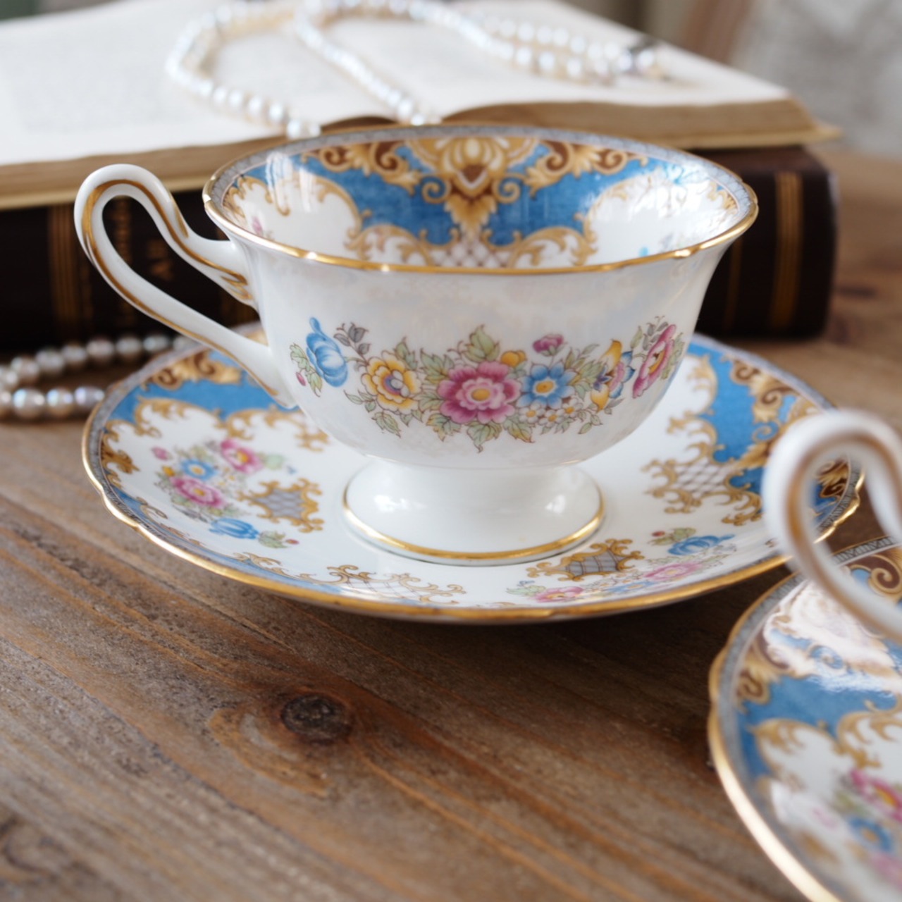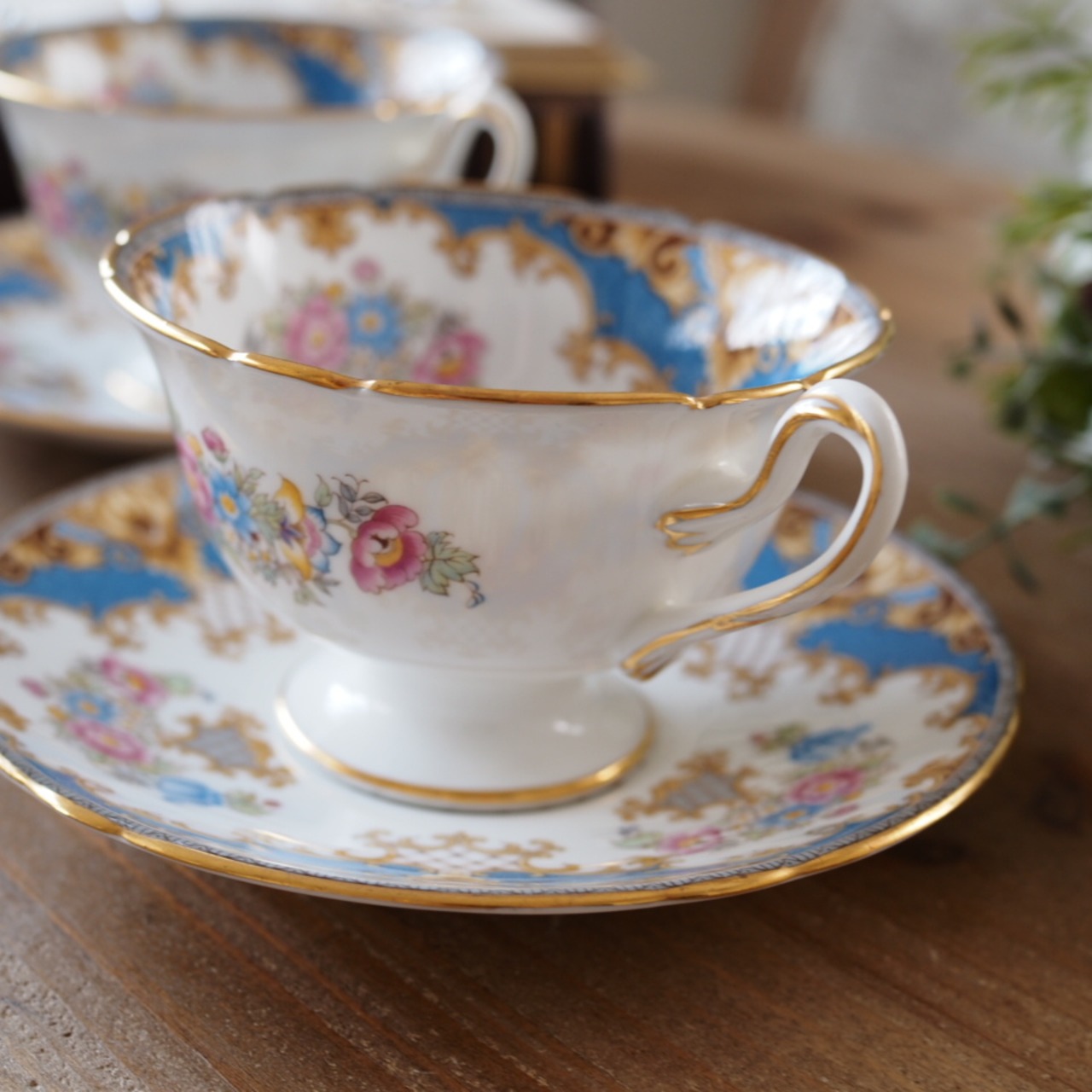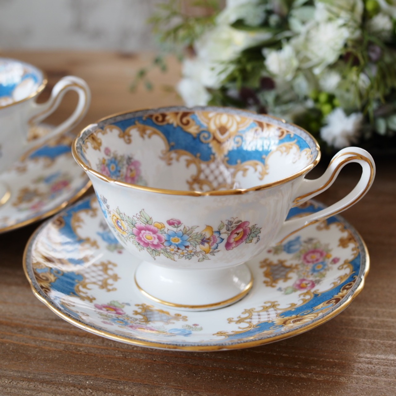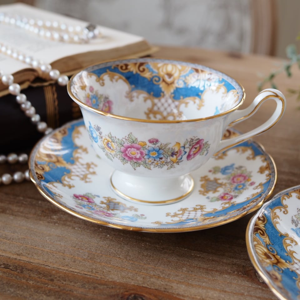 英国シェリー シェラトン 華やかなブルー花束 カップ&ソーサー2客セット