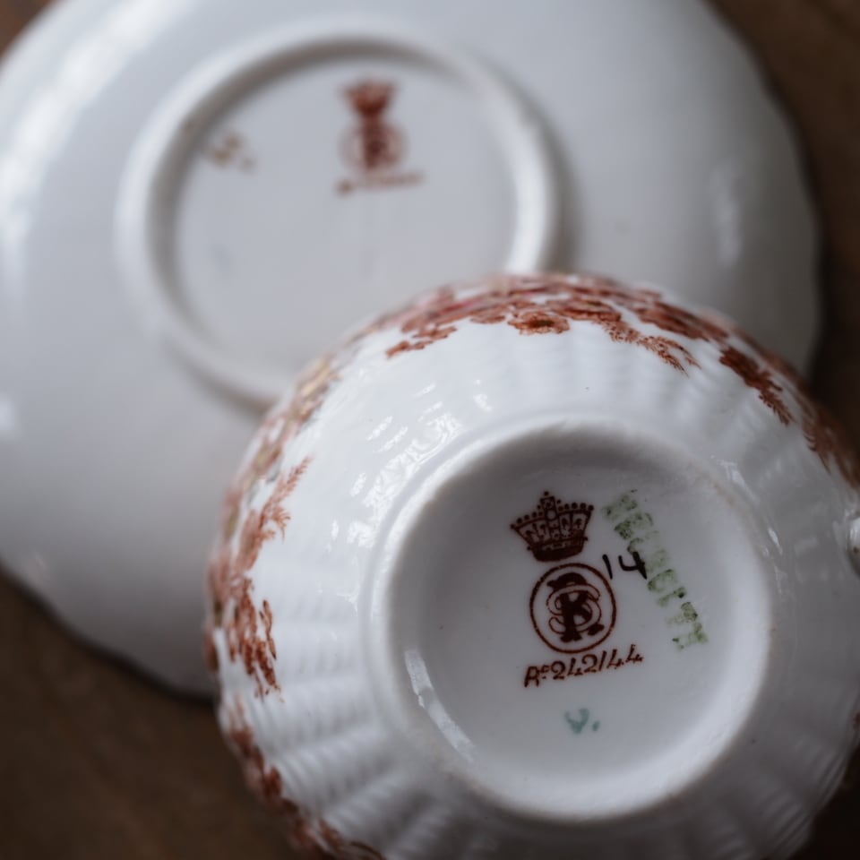 王冠マークと登録意匠番号が刻まれたバックスタンプを持つ作品で、細やかな花模様に金彩が施された上品な一客です。赤を基調に青や緑の差し色が添えられ、落ち着きのある色調の中に奥行きが感じられます。