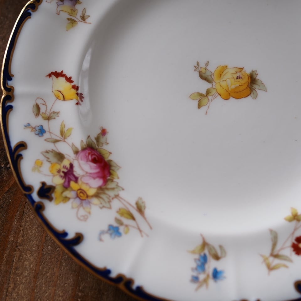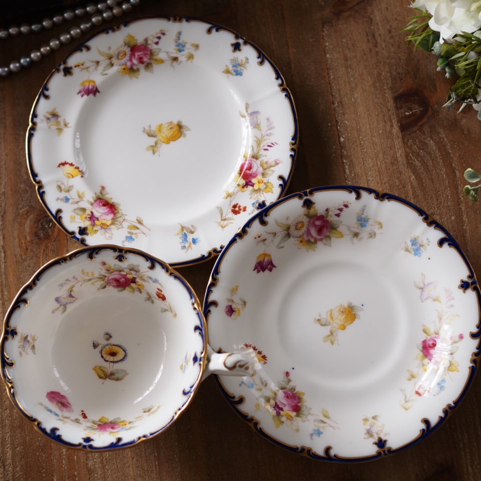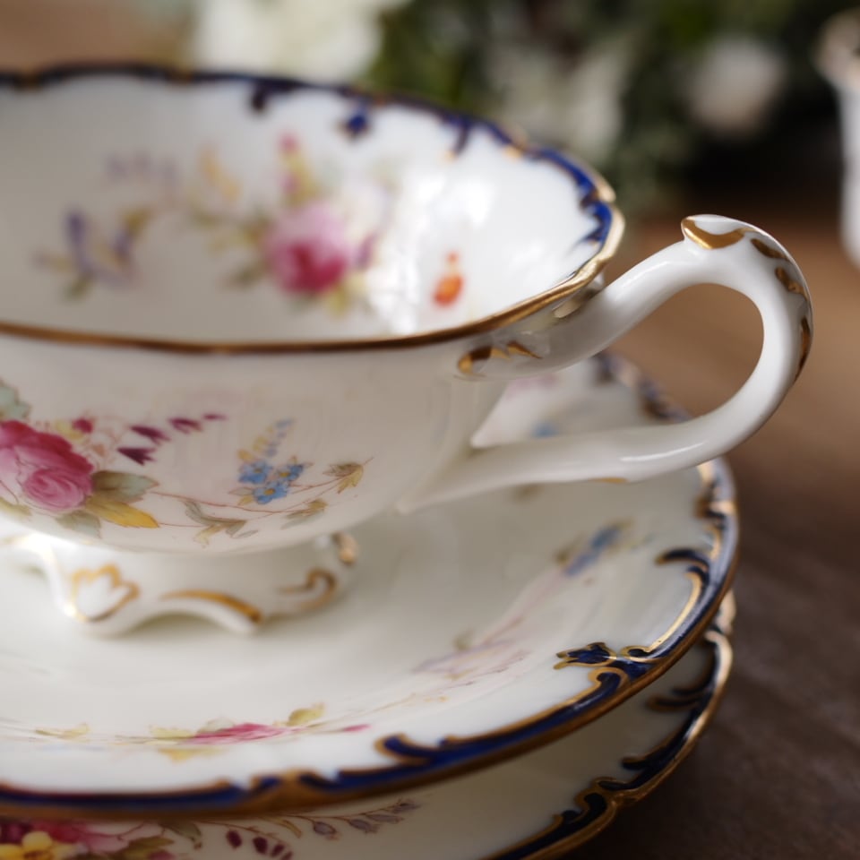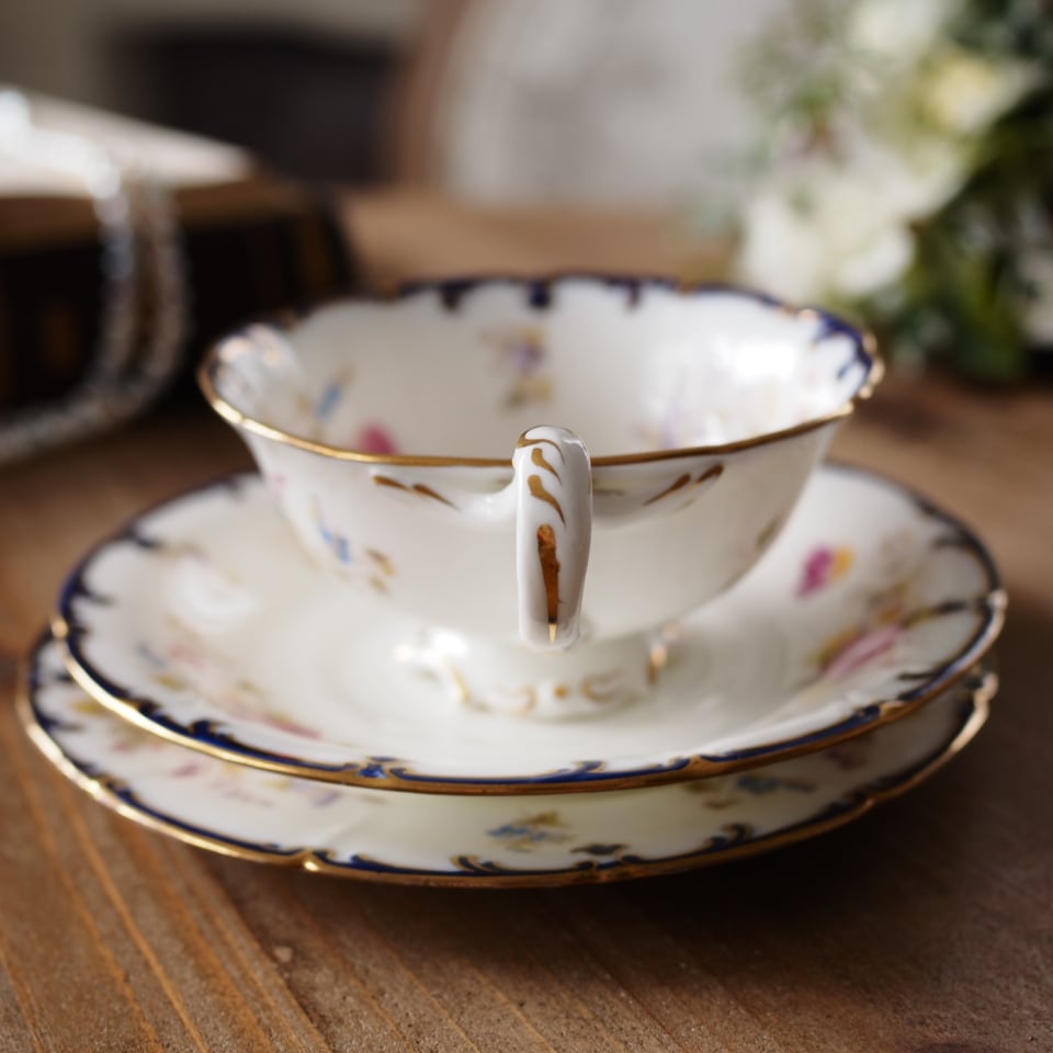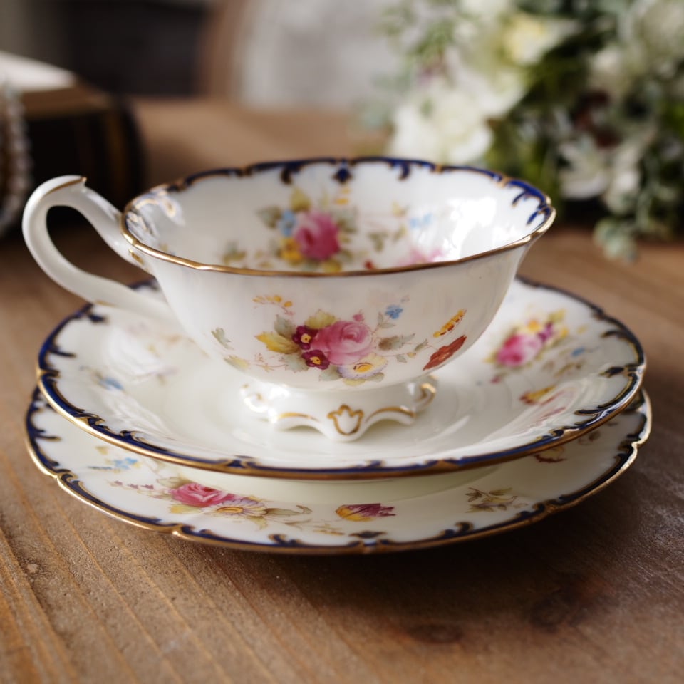 英国 Cauldon(コウルドン)が手掛けた、やわらかな花々と深いブルーの縁取り、そして繊細な金彩が美しく調和したアンティークのティートリオです。