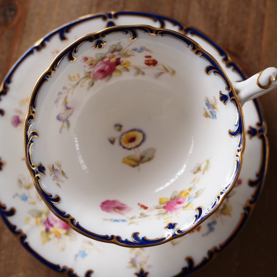 縁に施された濃紺(コバルト)の装飾は、金彩とともに上品なアクセントとなり、クラシックな英国スタイルのティータイムを演出してくれます。