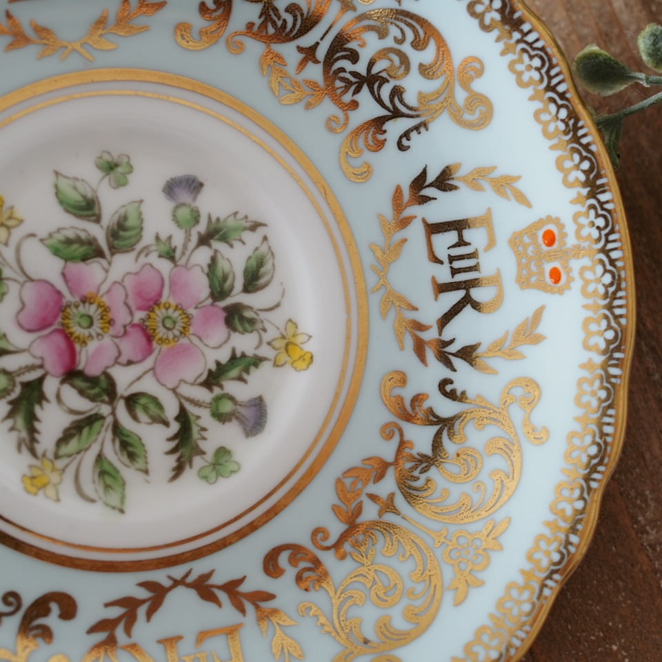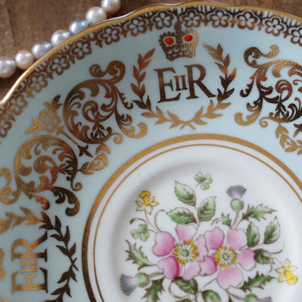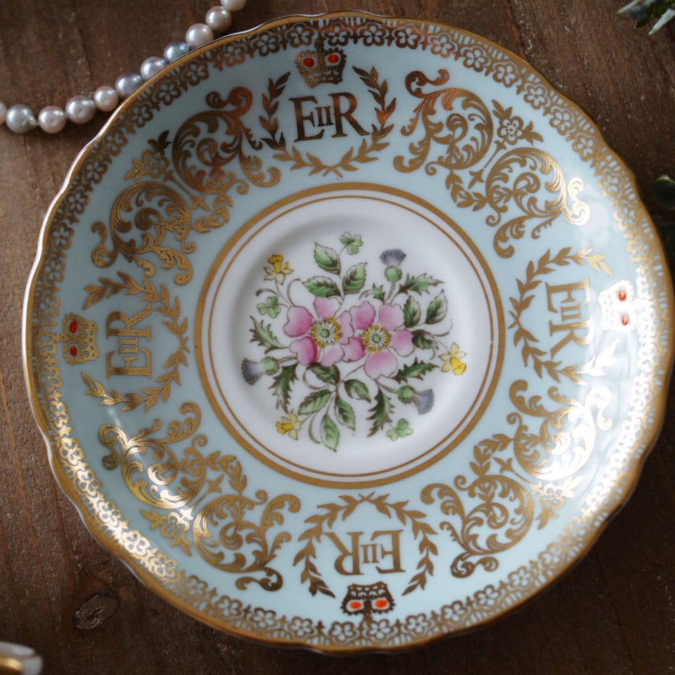 淡い空色の地に、王冠と「EⅡR(Elizabeth II Regina)」のモノグラムが金彩で優雅に描かれ、英国王室らしい格式と華やかさを感じさせます。